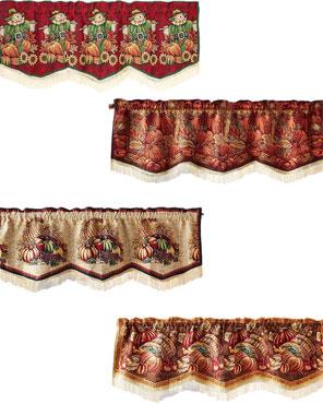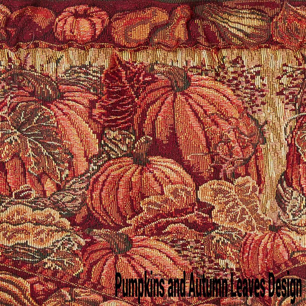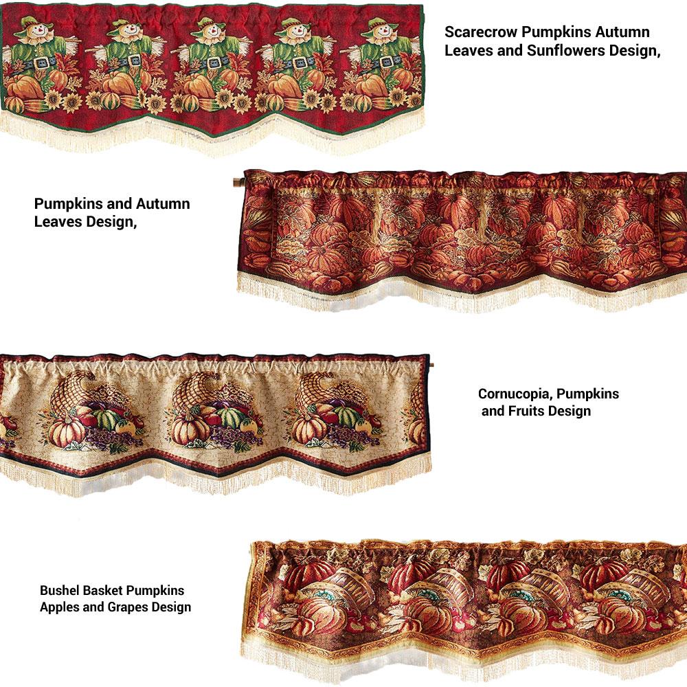 Welcome the autumn season with this festive Fall Tapestry Scalloped Valance. It is the perfect way to start your decoration for the upcoming season. With its delicate needle point look this valance will surely add a beautiful touch of Fall to your home decor. Made from 52% Cotton 48% Polyester, has a 1-inch rod pockets, decorative 2-inch header and finished with a golden scalloped fringe. Sold Separately. Coordinate with a, 19”x 27” Tapestry Rugs13"x 70" Tapestry Table Runners and 18” X 18” Throw Pillow Cover
