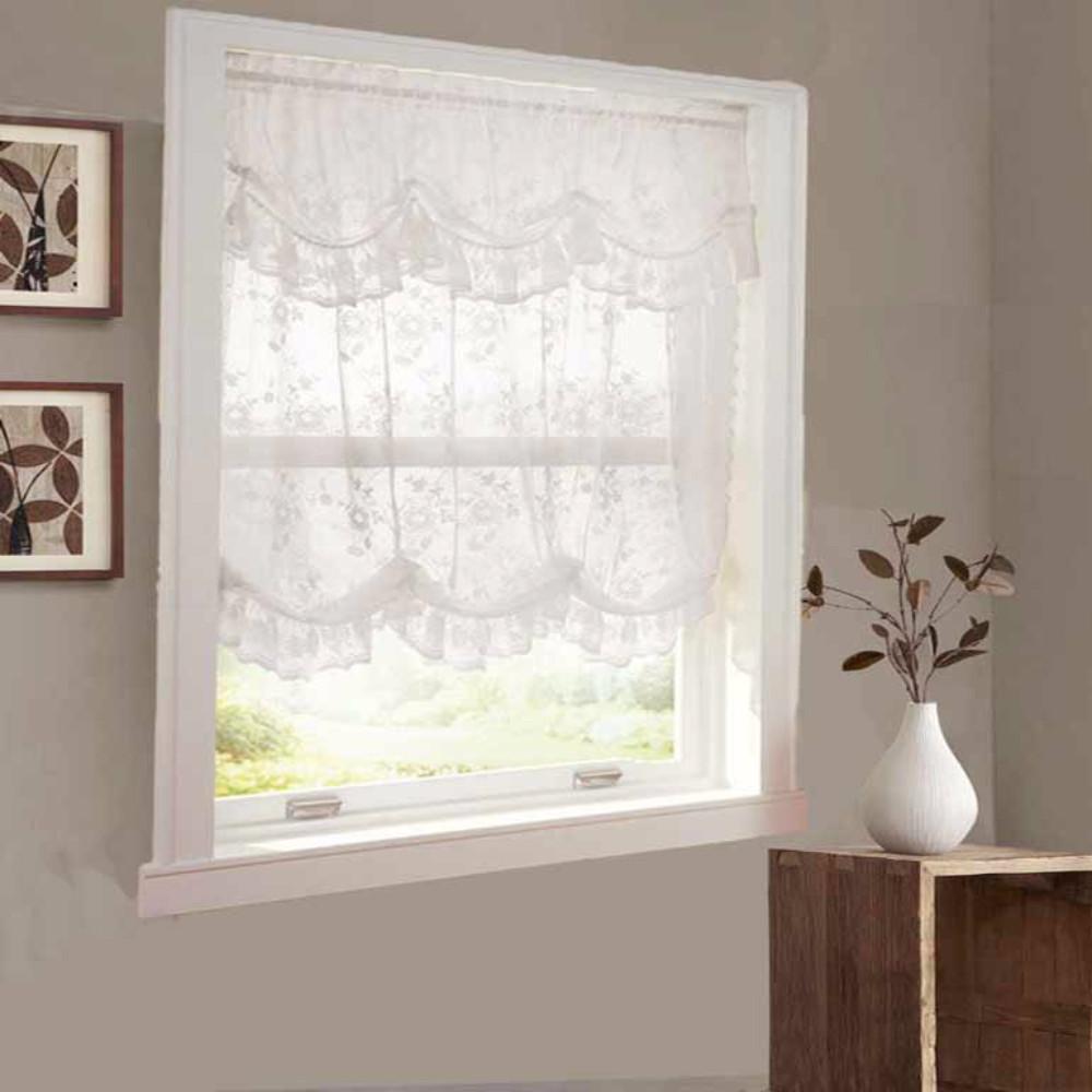This balloon shade by Lichtenberg features classic lace design with beautiful etched floral motifs and attached valance. Easily adjust the height of the shade using clips provided. This treatment is designed to be a stationary shade and does not move up and down except when manually adjusted with the clips.