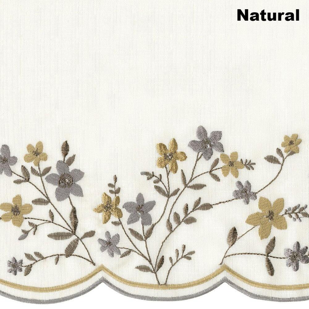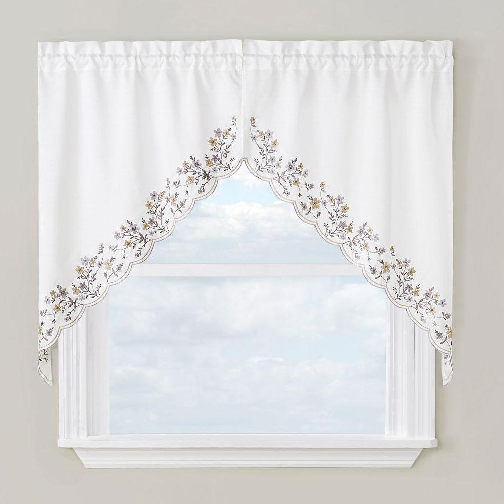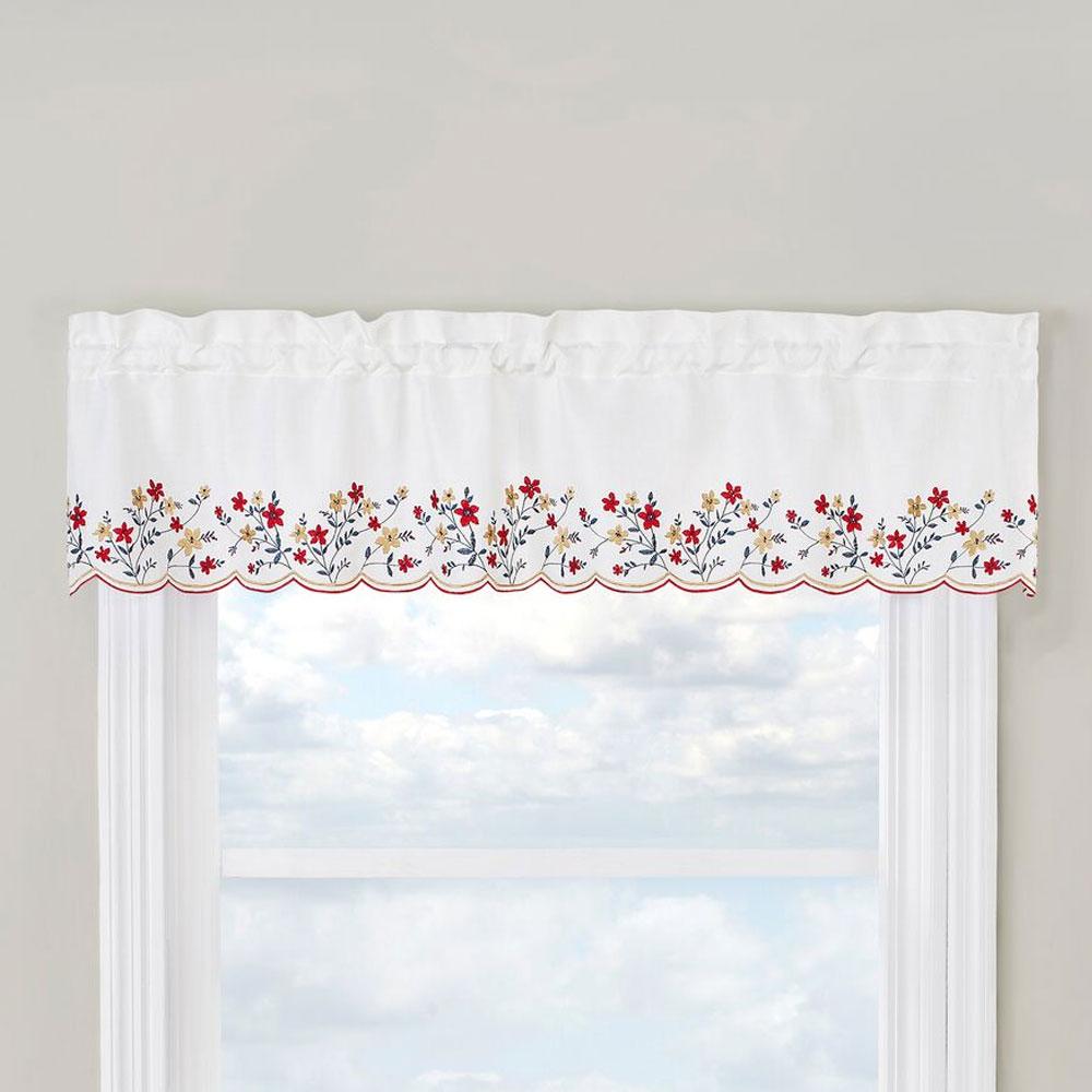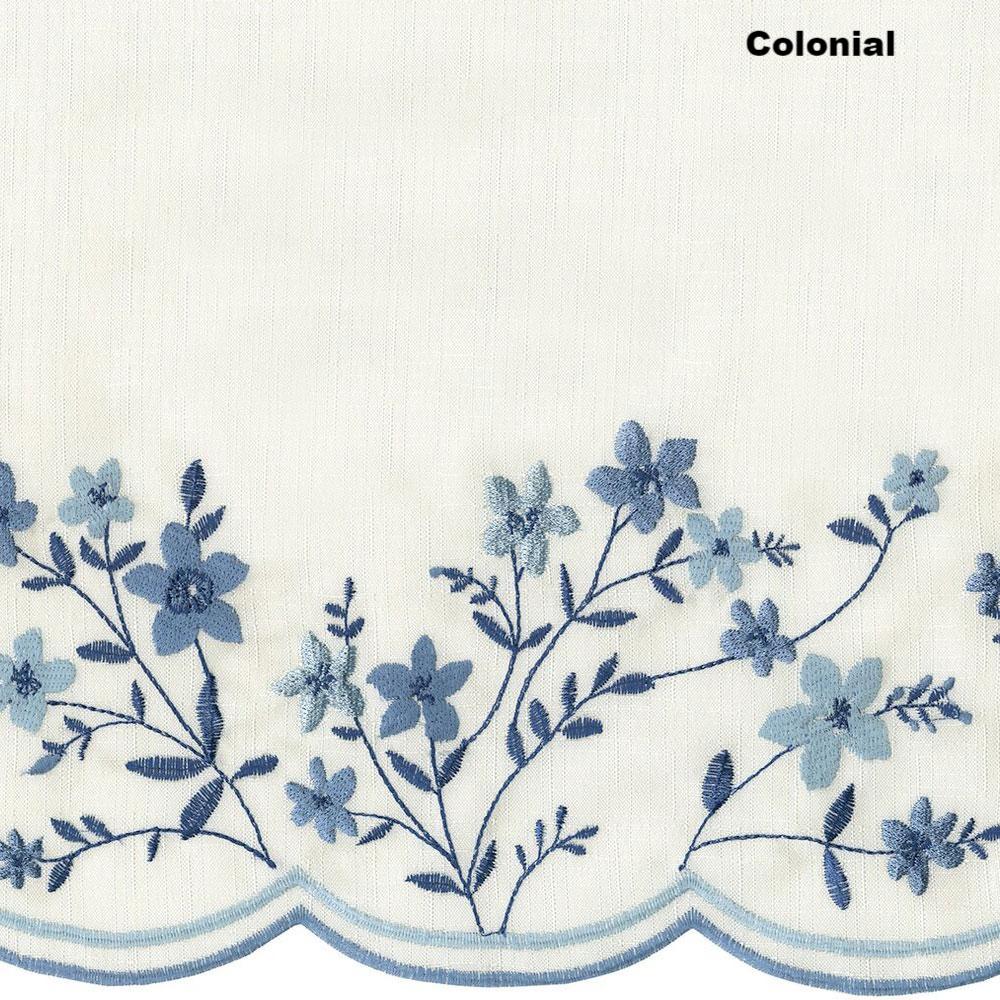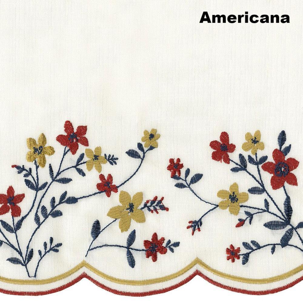 Blossom Embroidered kitchen curtain is sure to add a fresh floral look to your view; with its delicate embroidered floral design an finished with a merrow-stitched scalloped edging. Available in 3 rich colors Americana Colonial and Natural. Blossom Embroidered Swag or Valance looks beautiful on its own or paired with our coordinating tiers. Swag, Valance and Pair of Tiers are each sold separately