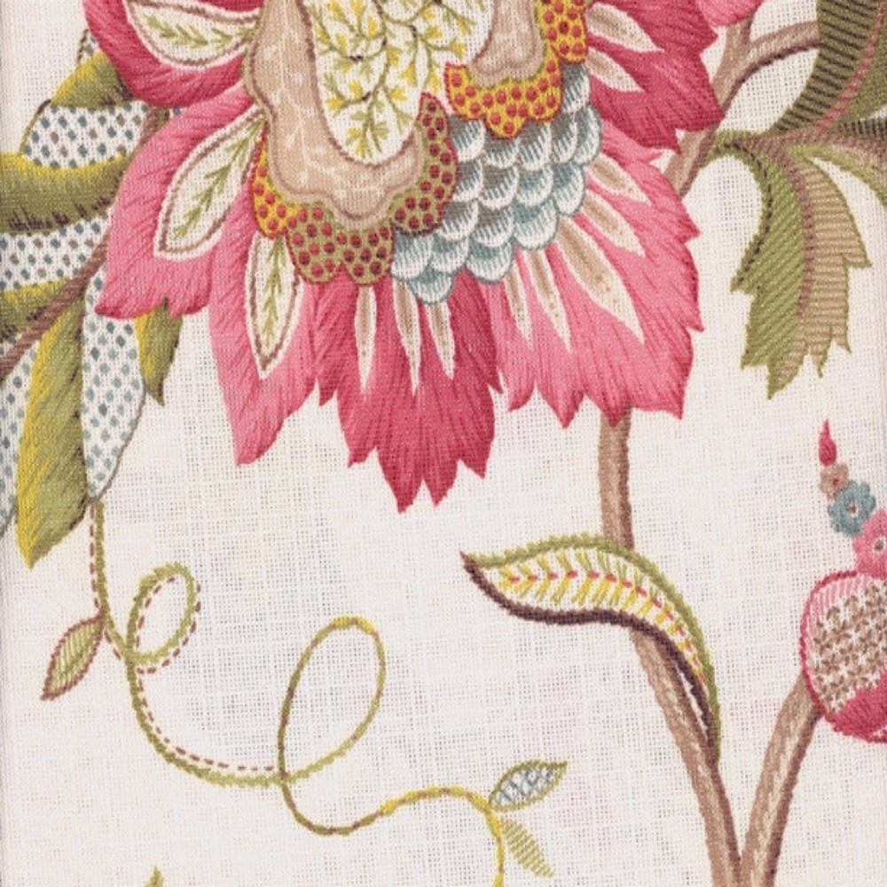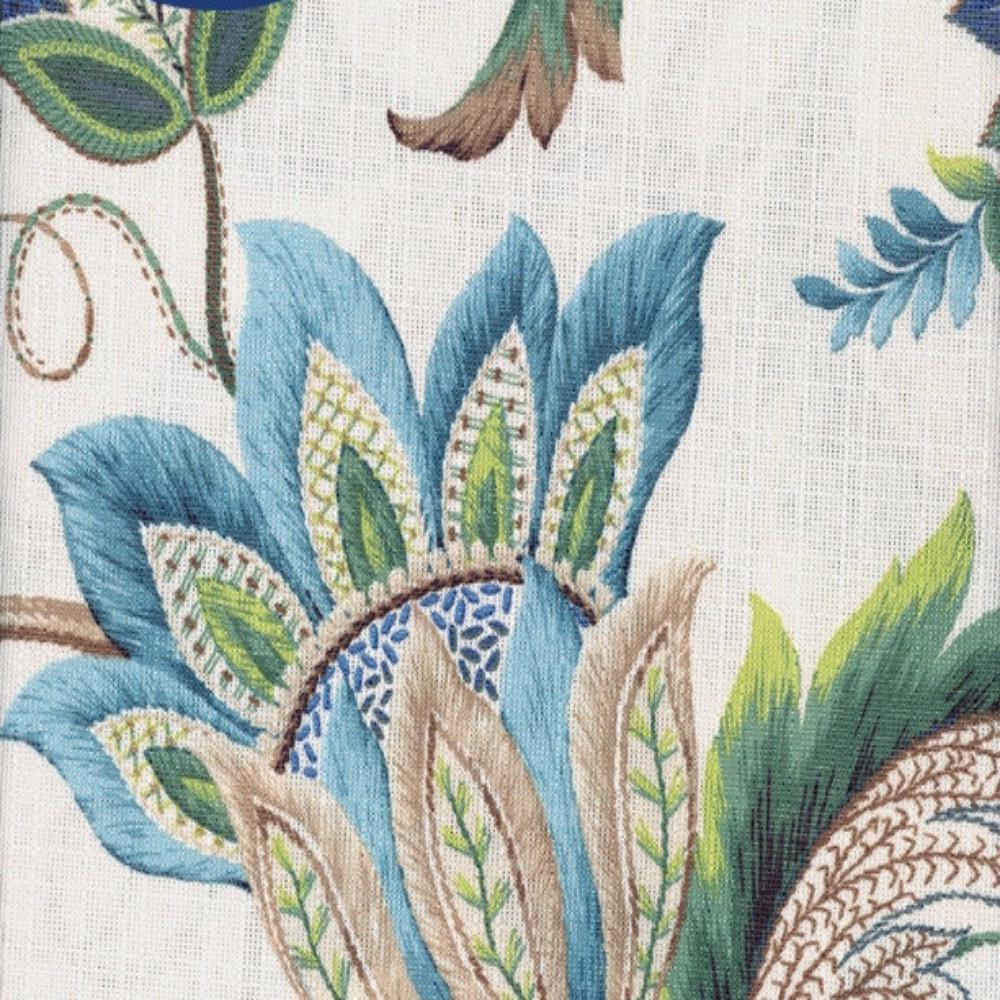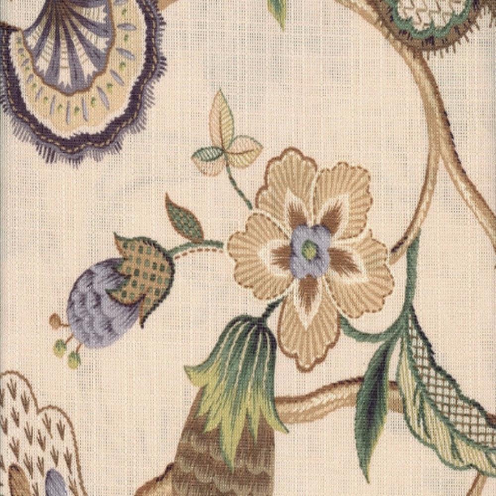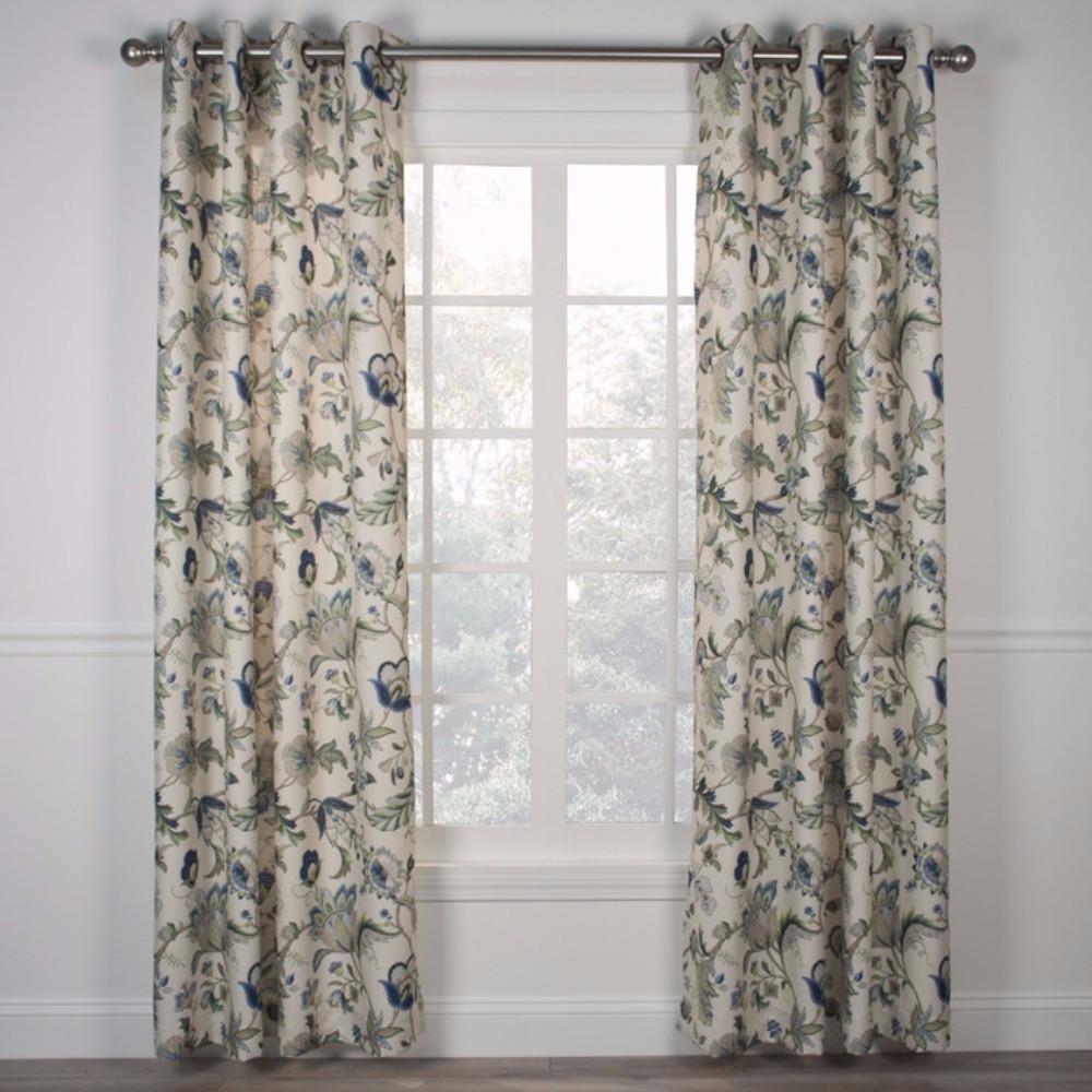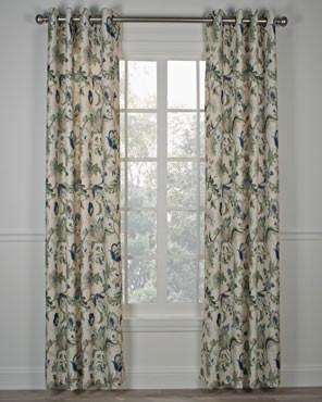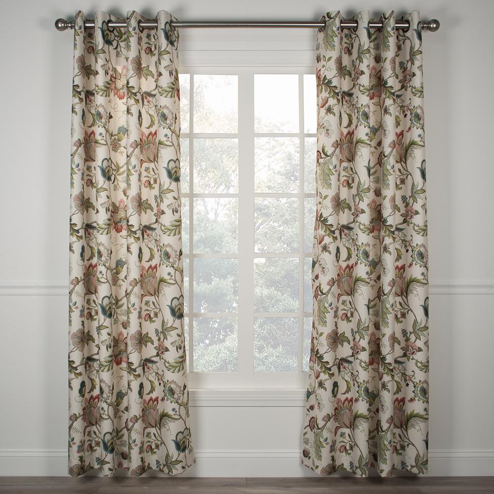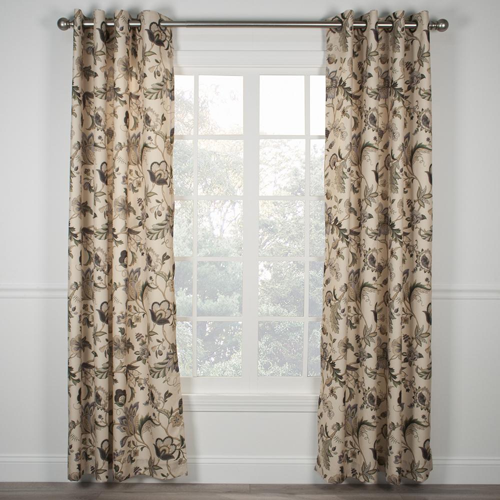 This captivating Jacobean Design brightens any room in your home. The Brissac Grommet Top Panel features eight silver metal grommets with 1 9/16" inside diameter and is fully lined in high quality white lining material. It's made of 100% Polyester Pebble Beach base cloth and is machine washable. Each beautiful panel measures 50 inches wide and is offered in lengths of 63 inches and 84 inches. Matching valance sold separately.