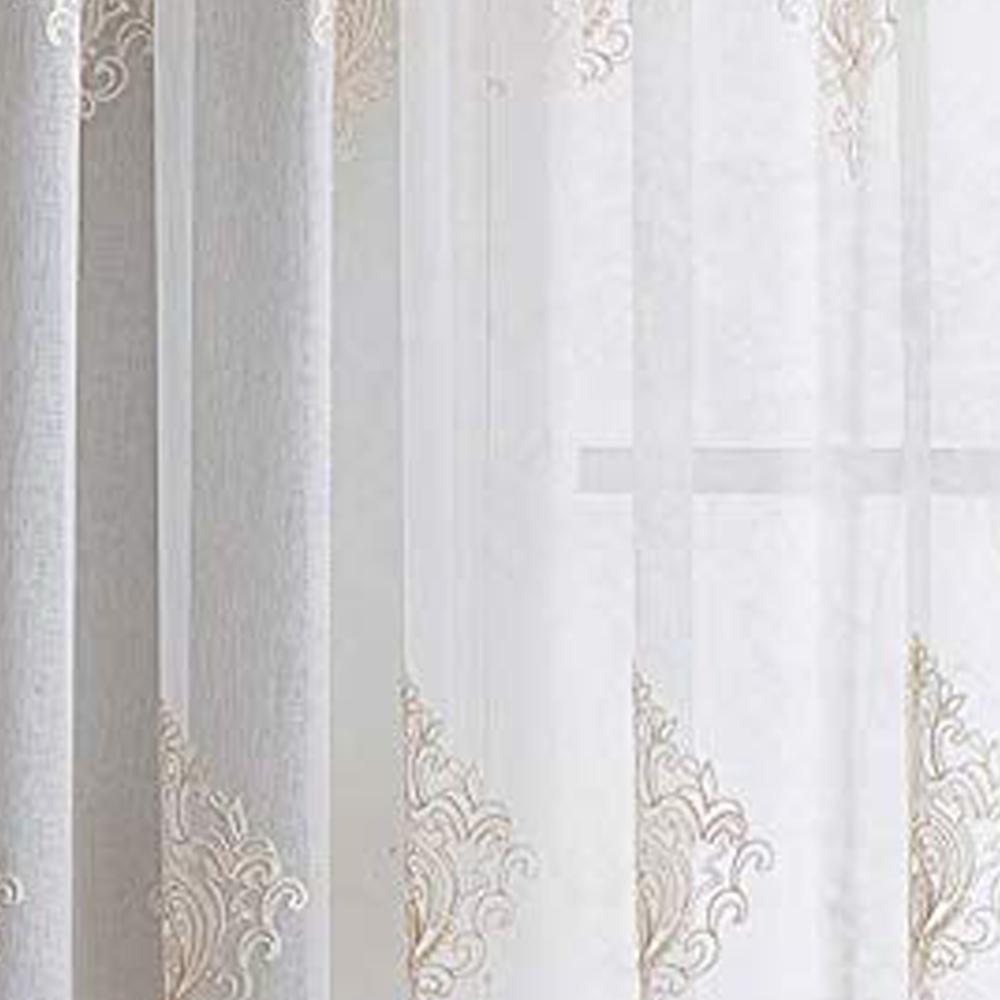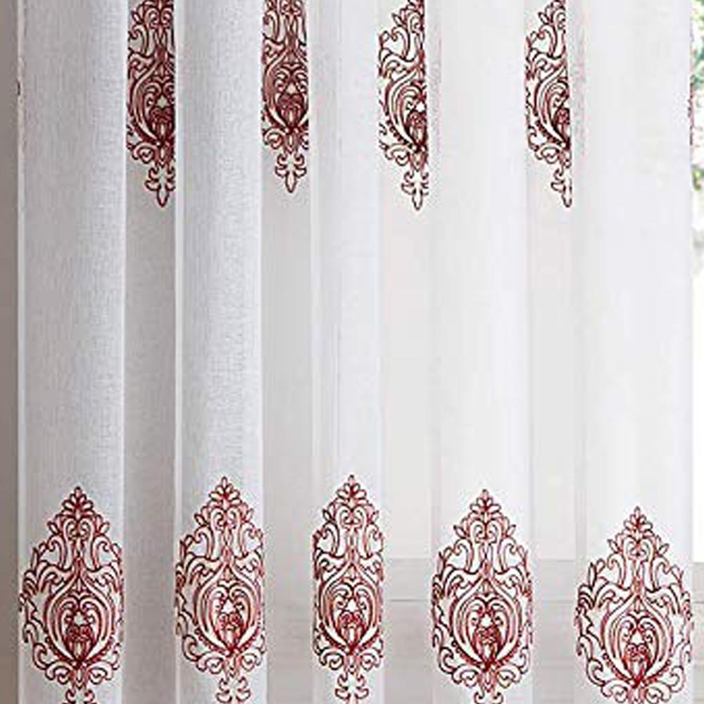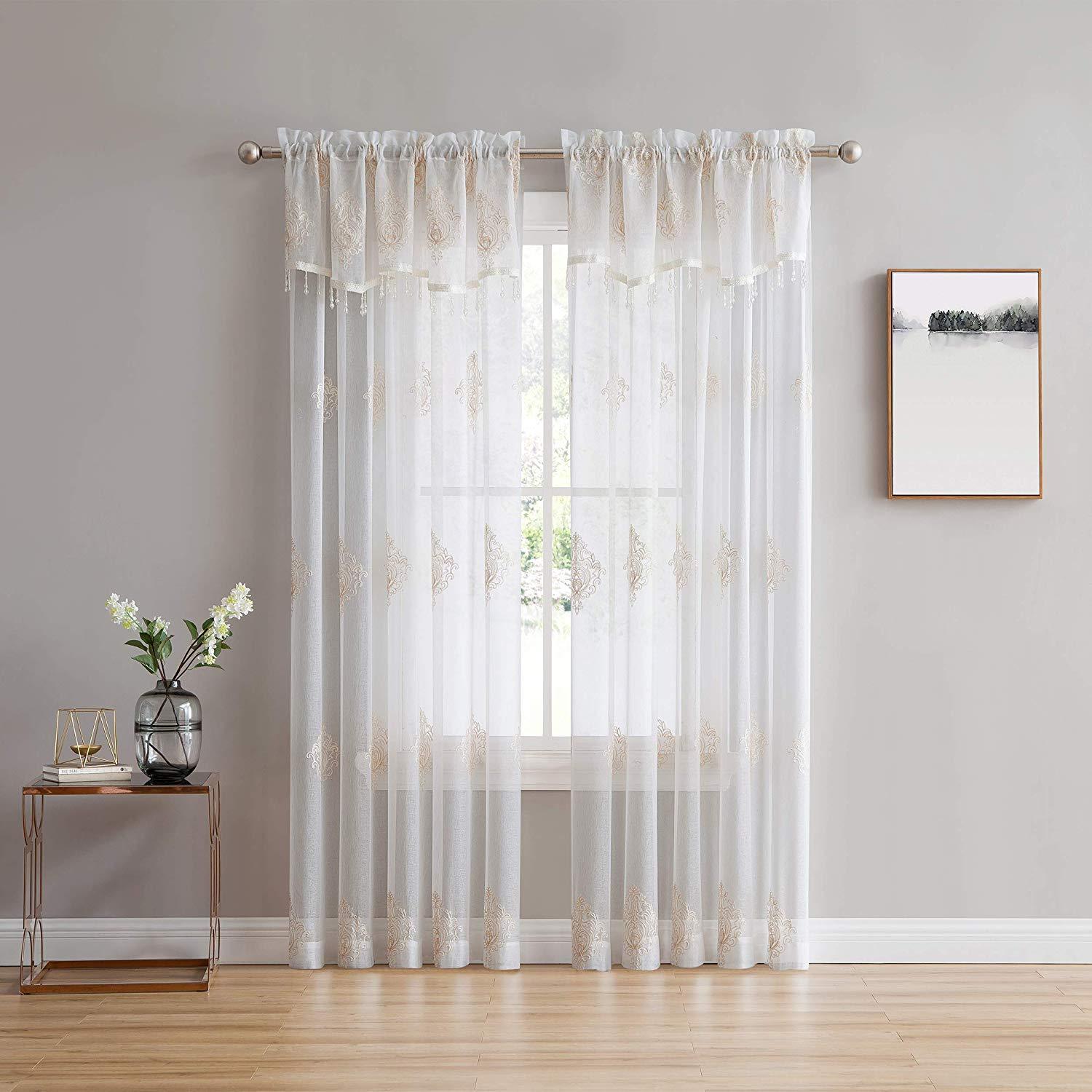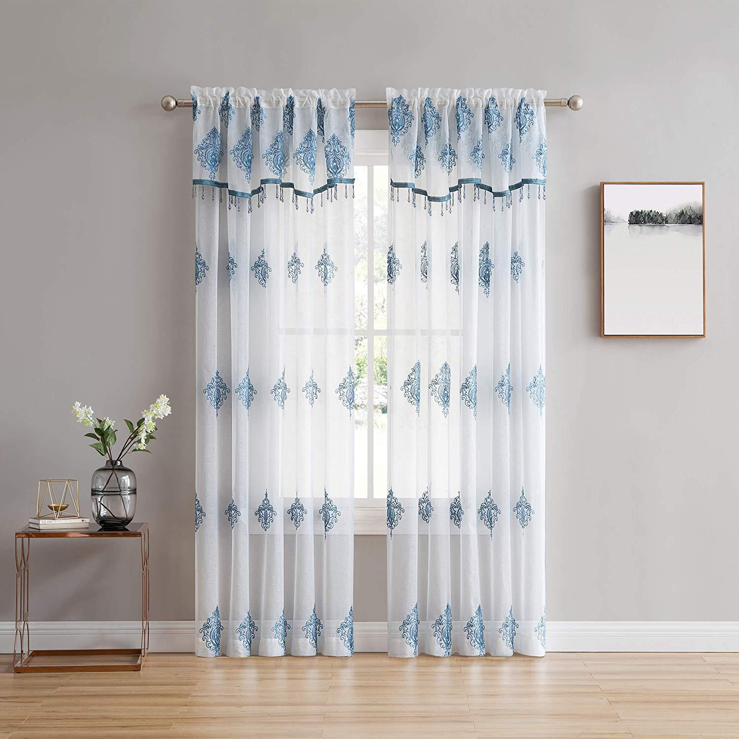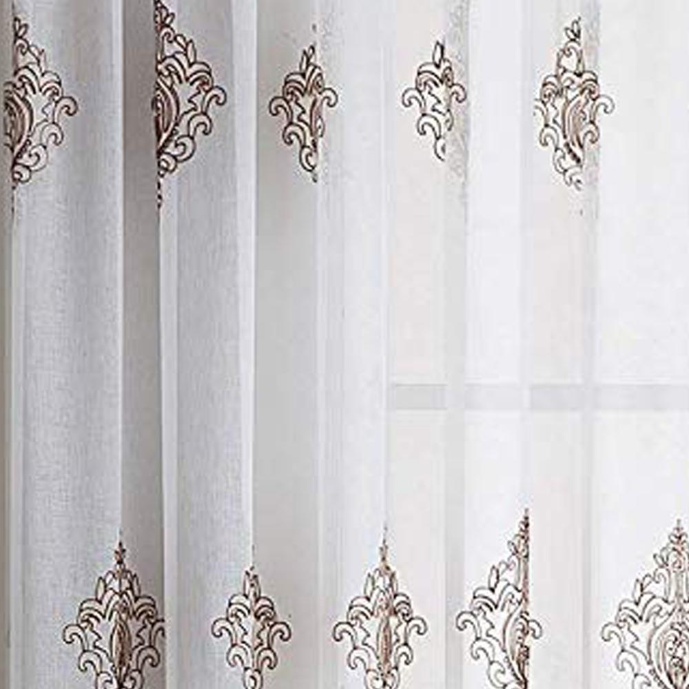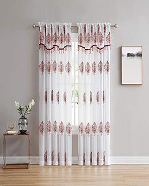 Style up your home with the Camila Sheer Embroidered Panel by Stylemaster! This beautiful curtain features an elegant embroidered pattern that sits on the panel. A curtain the will definitely make a statement in any home. The valance features the same beautiful pattern with a stripe color at the bottom and beads the hang from bottom that match the color as well.