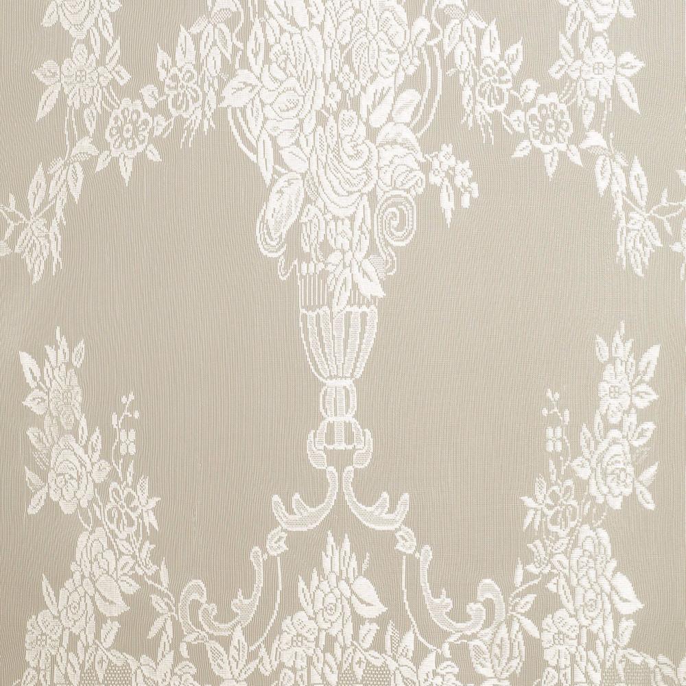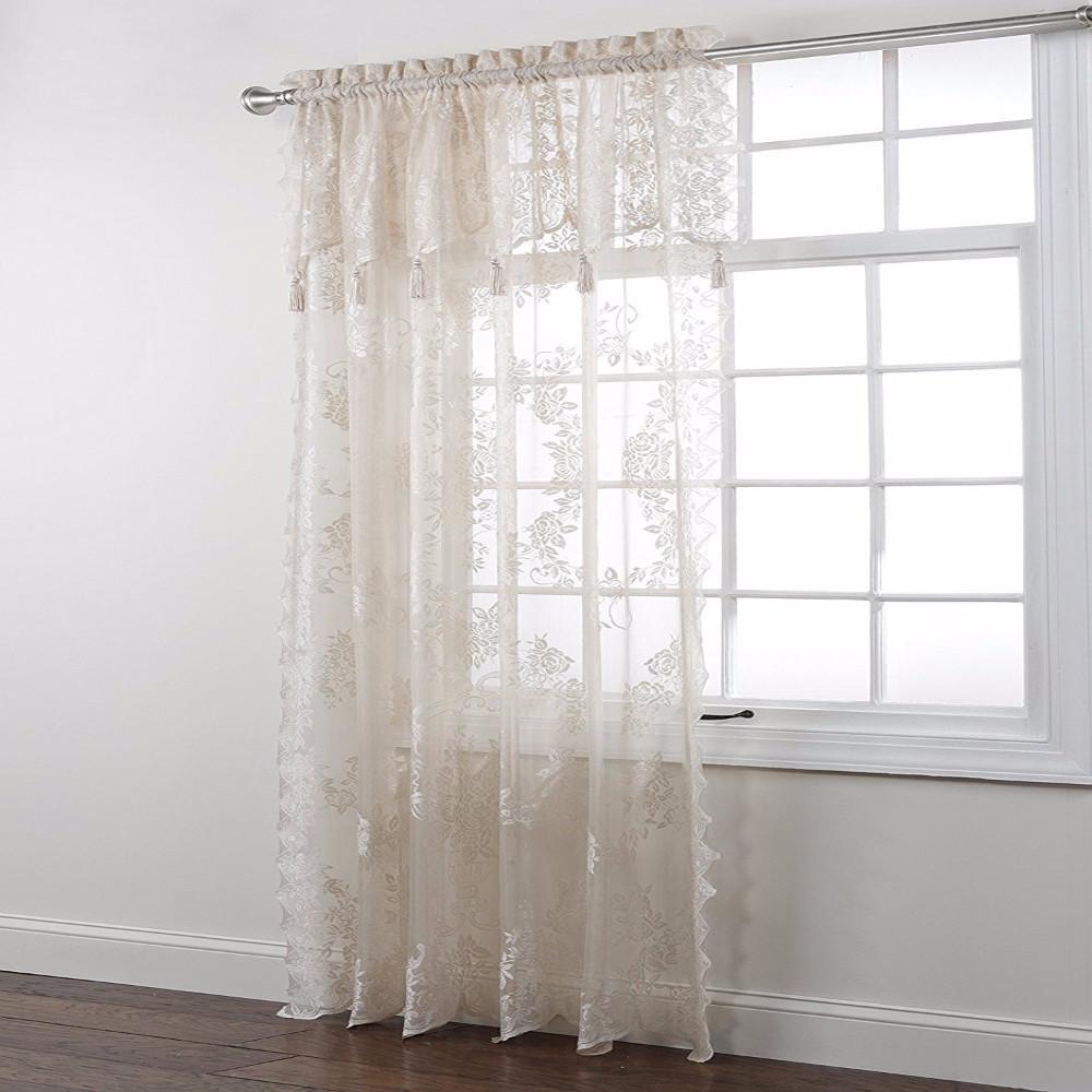 Carly Sheer Lace Panel with attached Valance is designed by Renaissance Home Fashions. Heighten the romantic ambience of a room with this lacy, whisper-light panel with attached valance. The Carly sheer lace panel has a lovely rose motif and elegant scalloped edging along the whole curtain. The attached lace valance measures 18" long with a scalloped edge, a 3.5" tassels is placed at the tip of every scallop. Since the valance is attached to the lace curtain you will need only one curtain rod to give your window a complete look, however to create a full look we recommend to double your width to ensure you purchase the proper amount of curtains to cover your window.