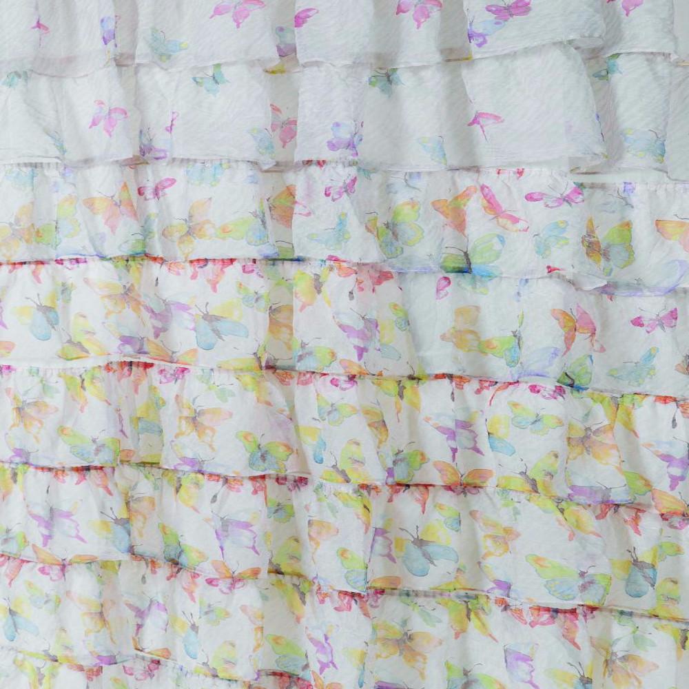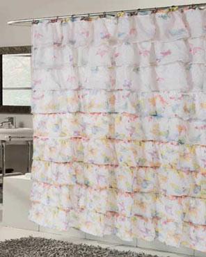 Colorful pastel butterflies on elegant ecru tiered ruffles decorate this beautiful Carmen Butterfly shower curtain by Carnation. This crushed sheer voile shower curtain is sure to make a statement and brings the charm of spring to your bath.
