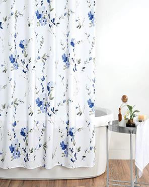 The beautiful Charlotte Fabric Shower Curtain by Croscill features flowers with blue pedals that flow throughout the entire curtain. The white background really make the flowers pop. A beautiful addition to any bathroom.