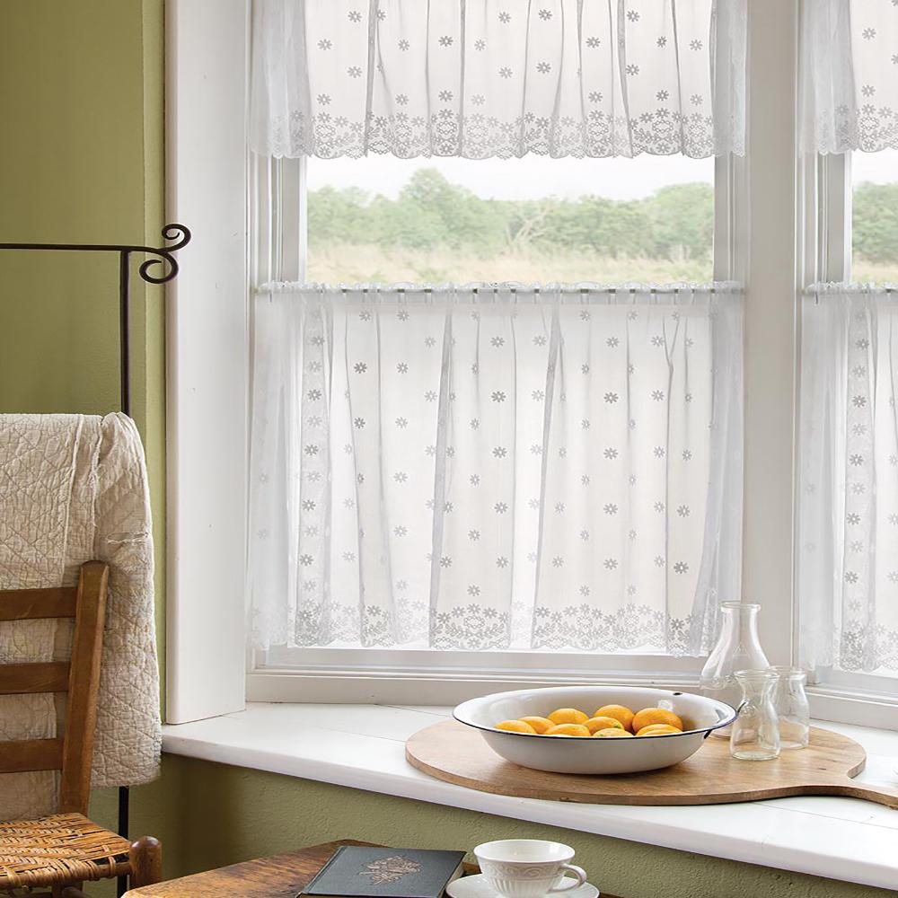 Wake up your windows with the light and breezy Daisy Lace Tiers and Valance by Heritage Lace. These tiers and valances feature a soft floral edge detail complemented by delicate daisies that float across the sheer netting. Proudly made in the USA. Available in two colors, white and ivory.