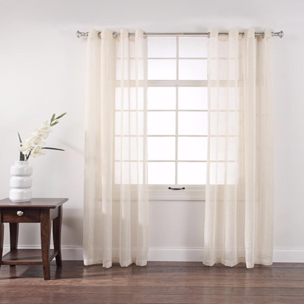 Dazzle metallic sheer grommet panel by Stylemaster will hang beautifully in your window thanks to its unique shimmer fabric. The lovely lurex fabric can be hung alone or paired with heavier grommet panels to brighten up any space. The Neutral tones of frost, white or gold will work in any existing room décor. Both the Platinum and frost have a silver metallic threading throughout the panel to create a delicate shimmer in the textured fabric.