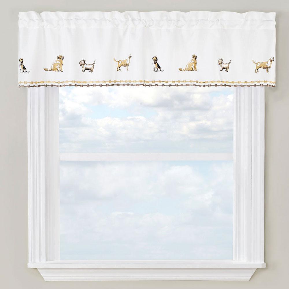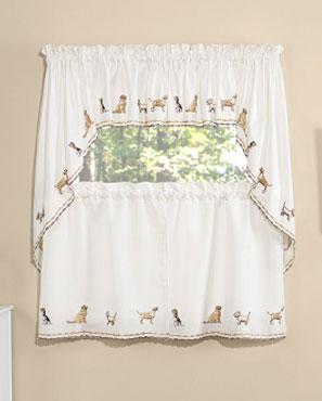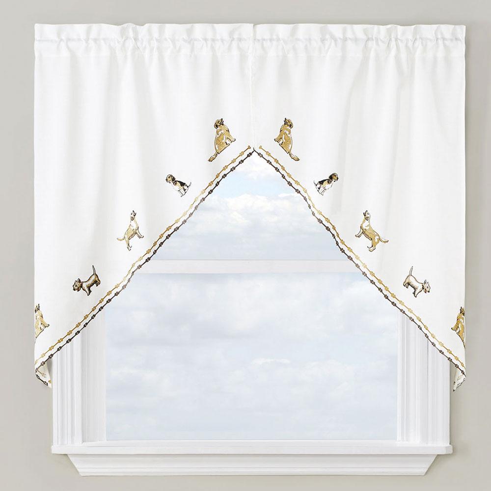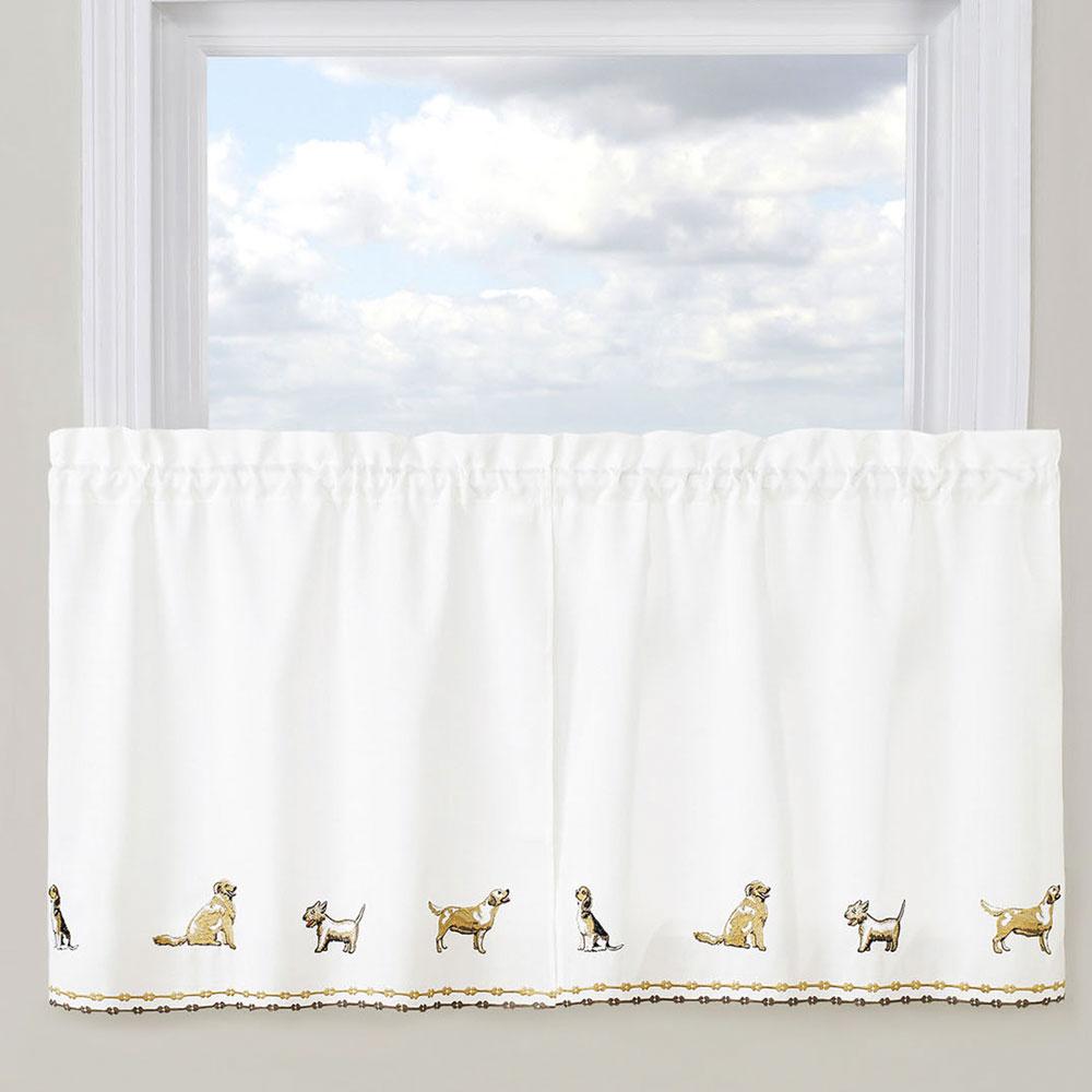 Dog Embroidered Cafe Curtain is a novelty kitchen curtains feature Beagles, Golden Retrievers, and White Westies embroidered along the edge of a woven solid natural color background. Accented with dog bones stitch across the bottom. They are perfect for your kitchen, bathroom, mudroom, laundry room and more. This café curtain will offer some privacy and help filter out the light. Made of 100% Polyester, is easy care, machine wash, and iron if needed. The pair of tier, Swags and valance each have a 1¾" inch rod pocket (all parts are sold separately).