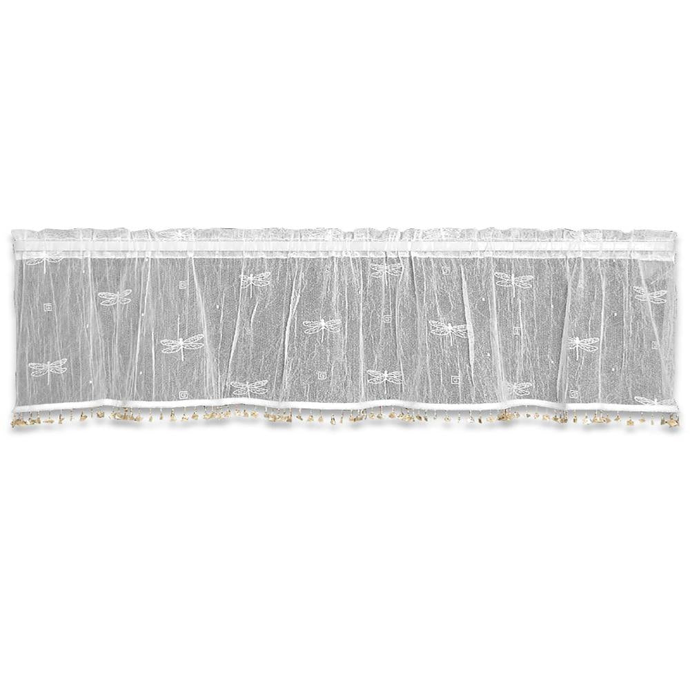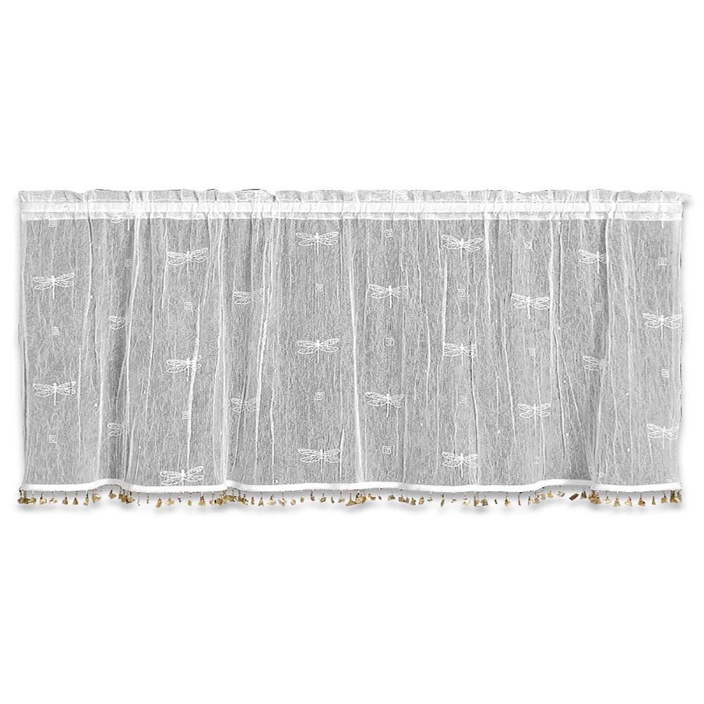 Let there be light with the Dragonfly Lace Tier Panel and Valance with Trim by Heritage Lace. These beautiful kitchen curtains feature dragon flies scattered throughout the panel and valances along with a trim of small shells.