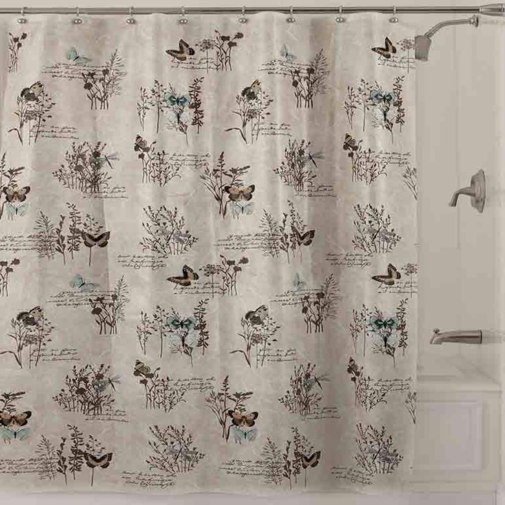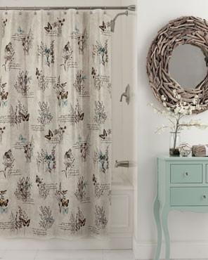 Enchantment is a peva shower curtain by Lorraine Home Fashions. The Enchantment vinyl shower curtain has a beige base with a white crushed print. Charming butterflies float between a brown botanical print with script. Enchantment is a lovely vinyl shower curtain that will great in any bathroom and is easy to maintain.