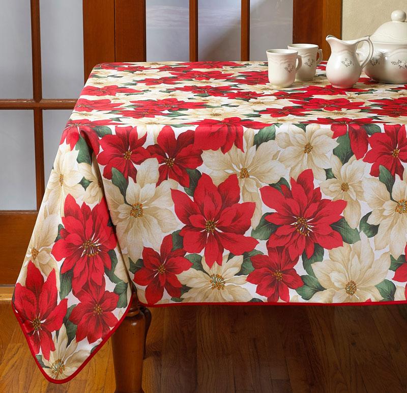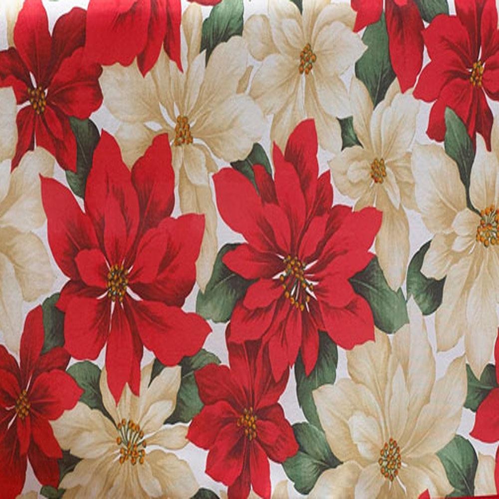 Take a twist on things with the Euro Seasonal Floral Fabric Tablecloth. This tablecloth is covered in bright poinsettias In Red and White.