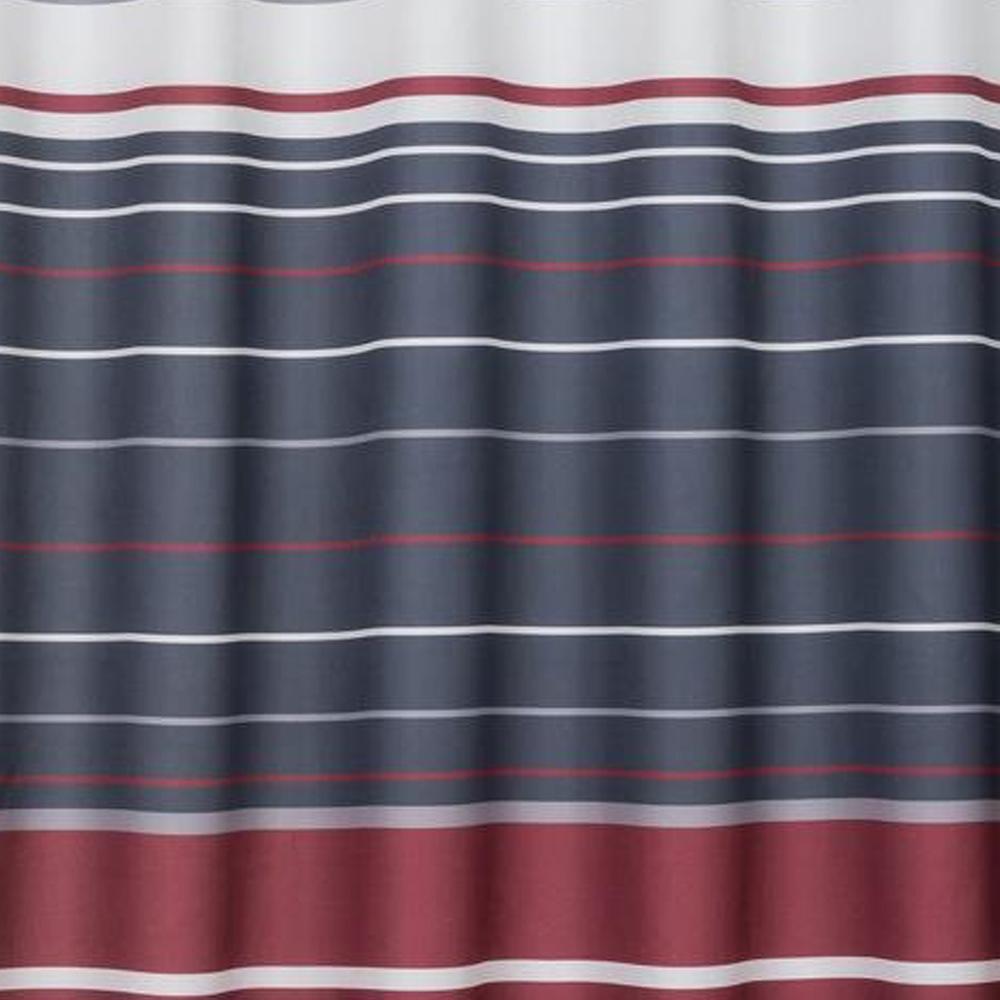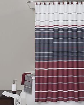 Bring a beautiful modern look to your bathroom with the Evan Stripe Fabric Shower Curtain. This Fabric Shower curtain features three main colors, white, grey and red, with color stripes going across them that compliment each of the main colors. Definitely an eye catcher for any bedroom!