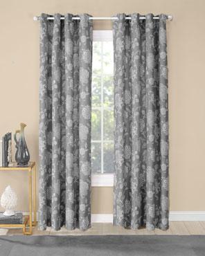 An elegant floral print adorns this beautiful grommet top panel. Felicity adds a stylish touch to any room décor. Hanging from silver colored metal grommet the simplicity of this panel will make any window stand out. Use alone or pair it with a matching Lined Scalloped Valance (sold separately) for a more complete look.