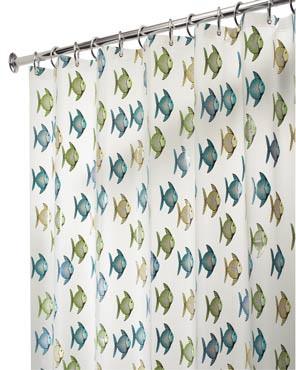 Fishy Eva shower curtain by Interdesign has blue, yellow and green fish swimming over a 100% Peva frosted shower curtain.