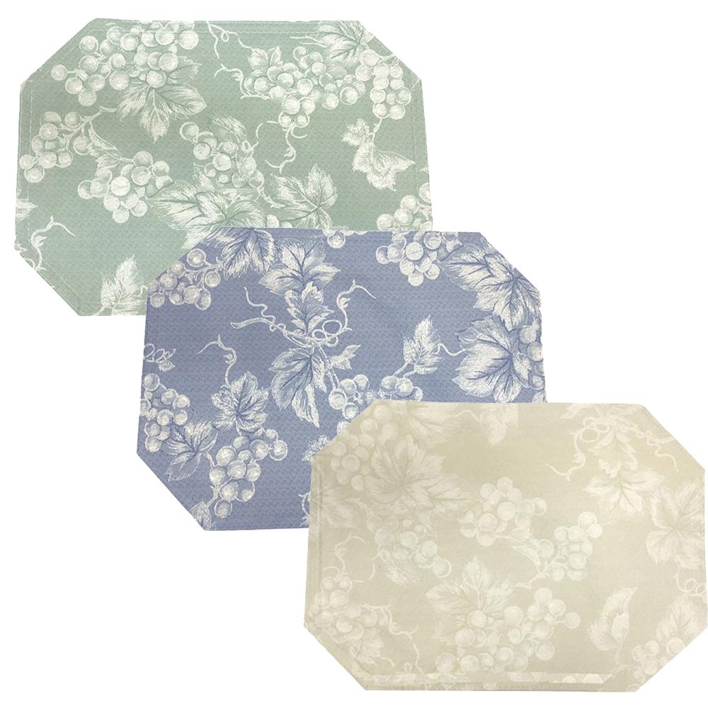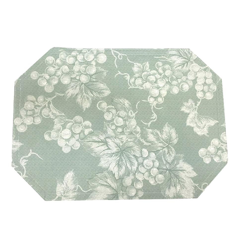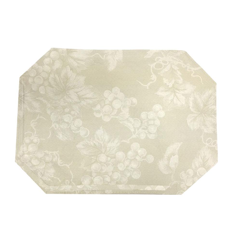 Bring some life to your table with the Grapevine Vinyl Placemat by Lintex Linens. This placemat features white grapevines and grapes throughout the entire placemat. A very simple, yet at the same time elegant placemat.