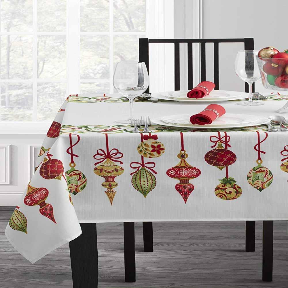 Bring the spirit of Christmas into your home with the Holiday Trimmings tablecloth by Benson mills. This beautiful tablecloth features a design of colorful ornaments that circle the tablecloth entirely.
