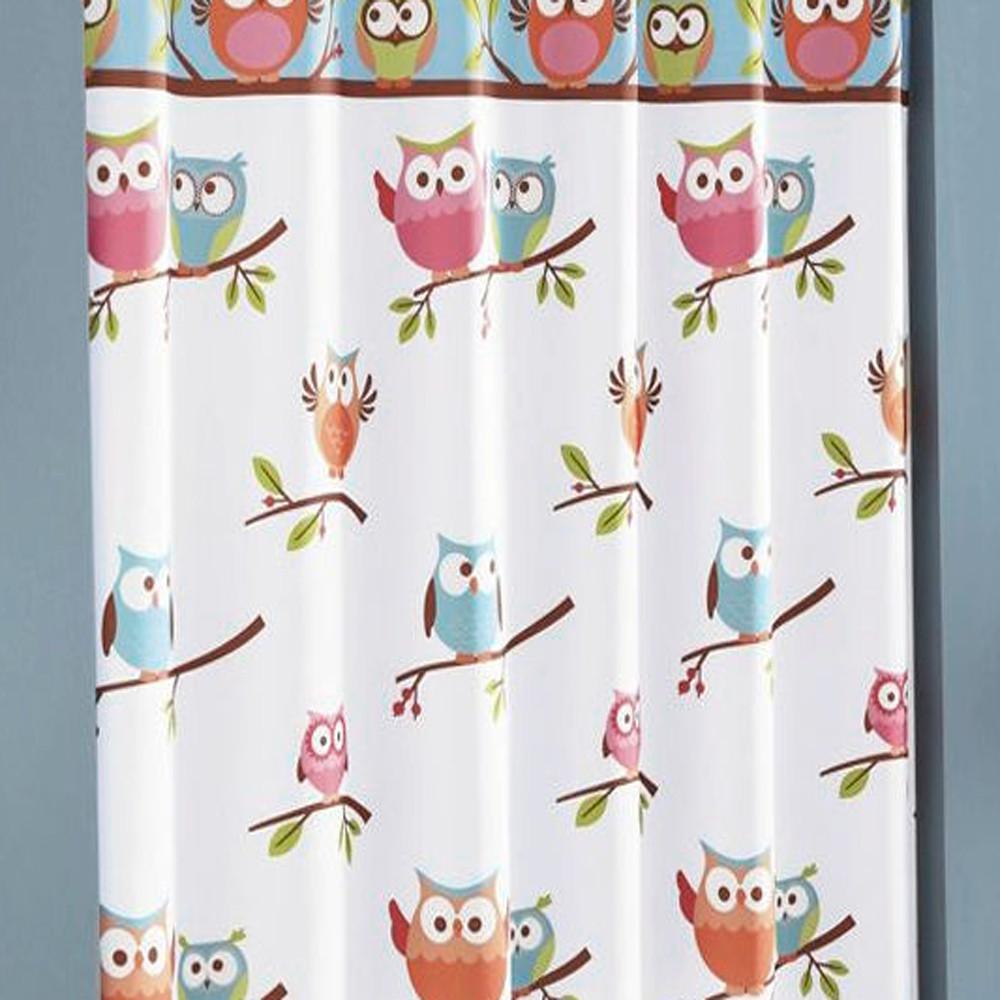 This Hooty fabric shower curtain will liven up and brighten your bathroom with its cute owls. This fabric shower curtain features adorable owls hanging out on branches. Not only is the shower curtain cute but, it is also made from a soft polyester, which is machine washable. Also available are the Owl Shower Curtain Hooks