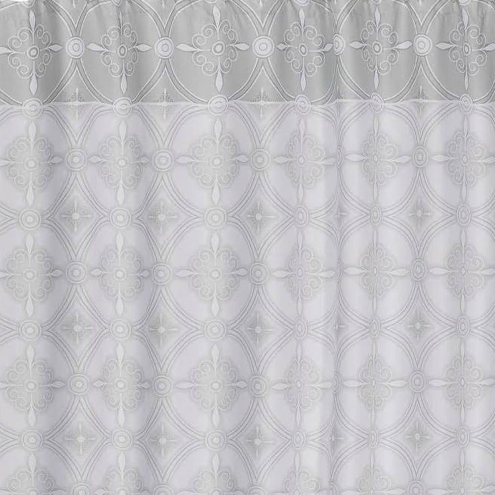 Ariel is a graceful and elegant fabric shower curtain with a circular jacquard pattern in light silver tones on a white background. This shower by Jennifer Adams Home will revamp the look of your bathroom.