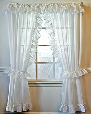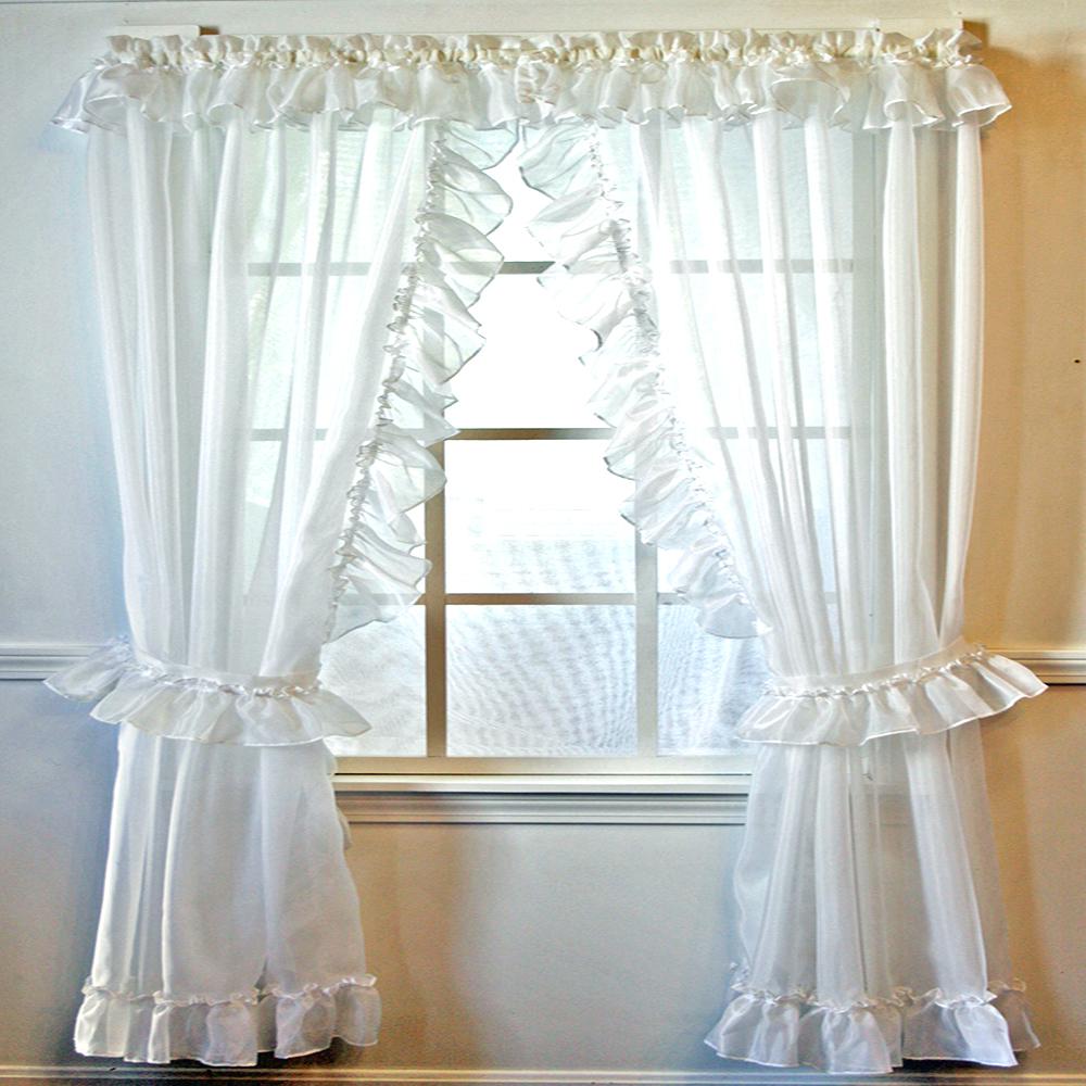 The Jessica Sheer voile priscillas are sold as a PAIR with tie backs, 4" ruffle and valance.