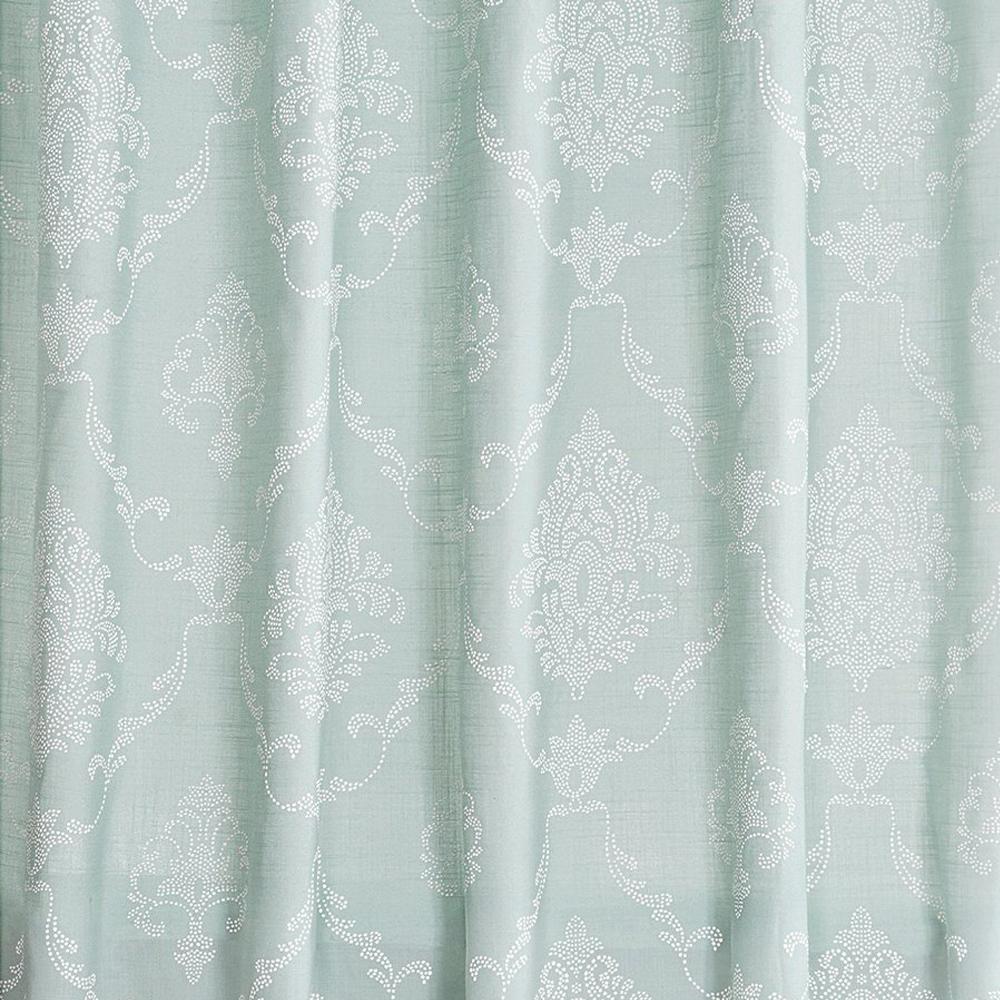 The Juno Fabric Shower Curtain by Croscill features a beautiful dotted royal pattern that is scattered throughout the curtain on a sea foam background. A definite eye catcher.