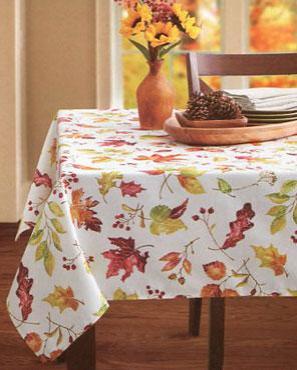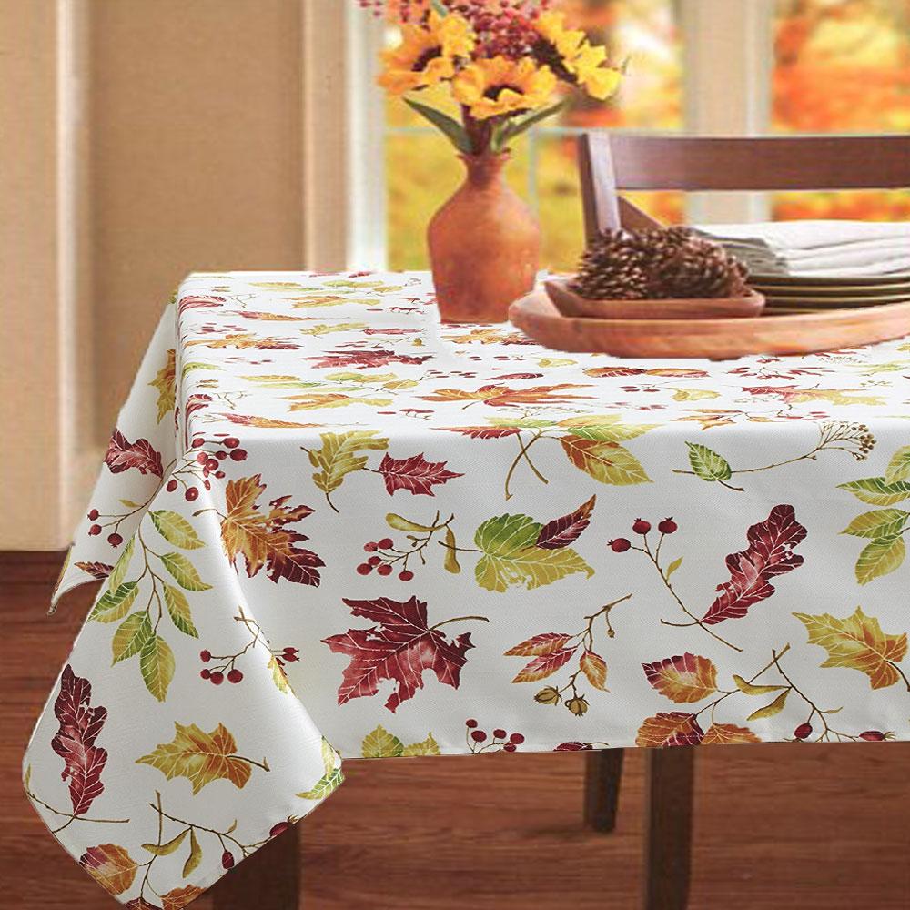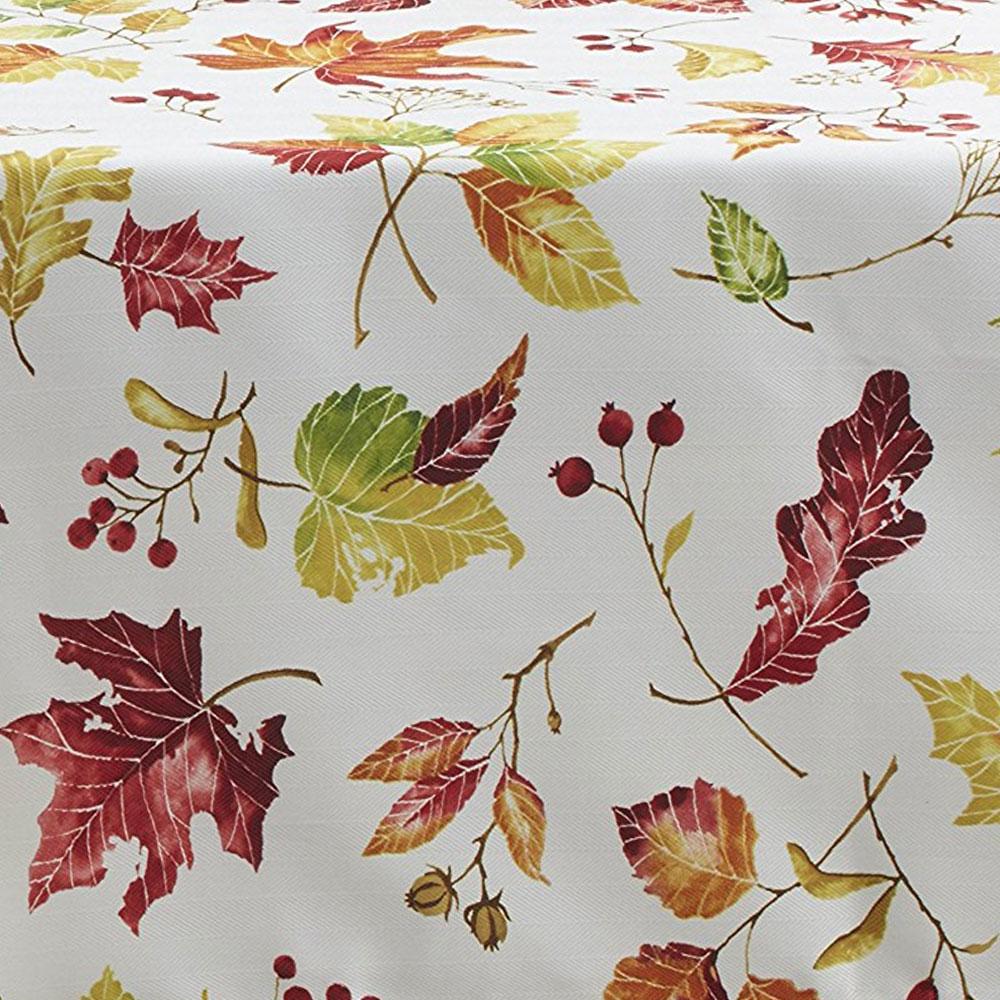 Leaves of Change fabric tablecloth by Benson Mills is a beautiful festive printed fabric tablecloth that is perfect for your holiday or autumn decor. This easy to care for, wrinkle resistant tablecloth features a scattered autumn foliage leaves pattern with various shades of red, yellow, orange, magenta and brown that will dress up any table during the fall and is perfect for Thanksgiving entertaining.