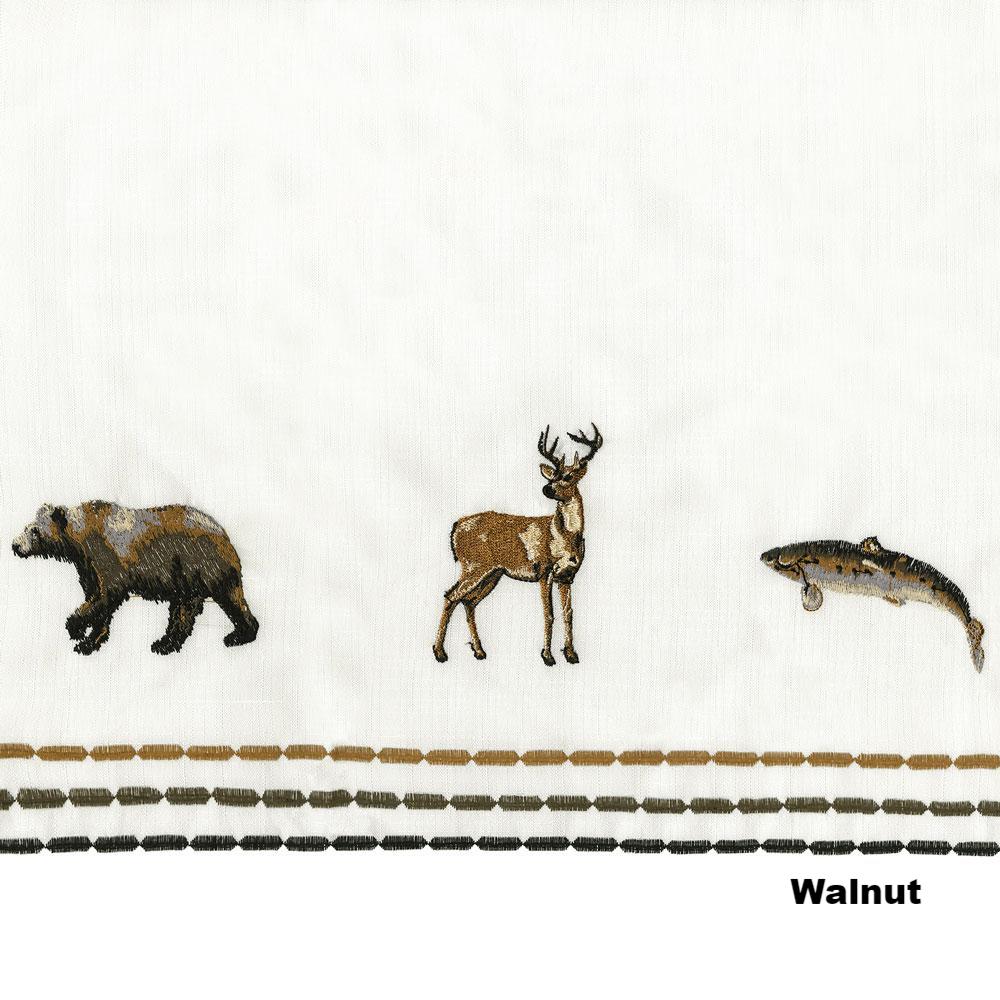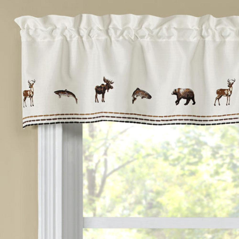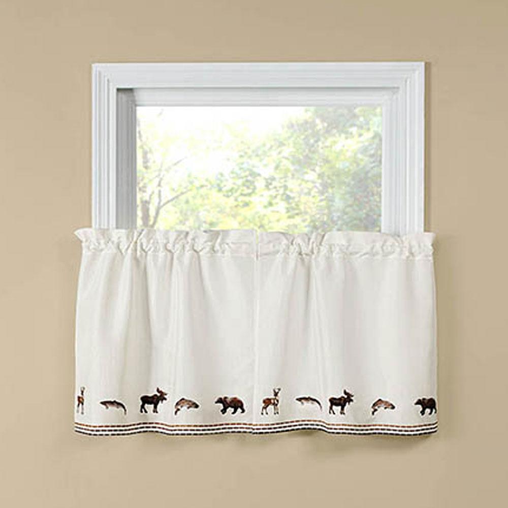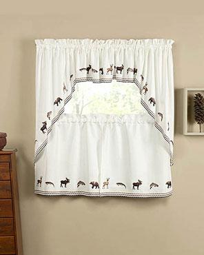 Lodge is a stylish café curtain with a Northwoods charm. This café curtain has embroidered deer’s, bears, moose’s and trout on a solid white background with contrast stitching in gold, brown and black along the bottom for a finishing touch. They are perfect for kitchen, bathroom, mudroom, laundry and more. This café curtain will offer some privacy and help filter out the light. Made of 100% Polyester, is easy care, machine wash, and iron if needed. The pair of tier, Swags and valance each have a 1¾" inch rod pocket (all parts are sold separately).