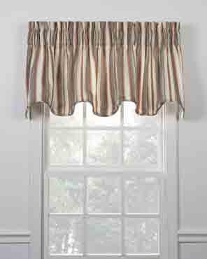 The Mason Stripe Lined Scallop Valance is a high quality window treatment made with a high quality fabric featuring a medium scale multi colored print available in a choice of 3 color patterns. This scallop shaped valance is lined with a natural color broadcloth fabric and finished with a corded edging along bottom to create a stunning effect when gathered on your curtain rod. Looks great alone or when combined with coordinating Mason Stripe tailored panel curtains or tailored tiers curtains (sold separately).