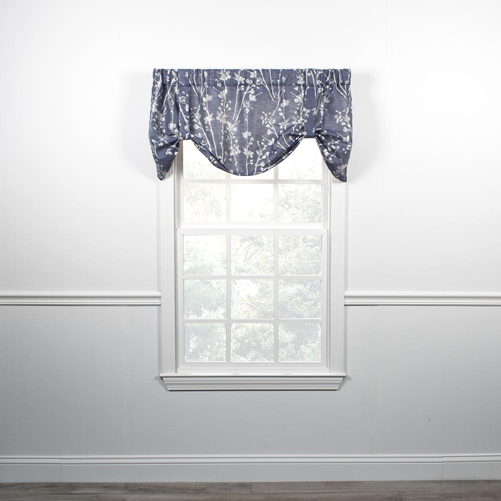 Bring new life into your home with the Meadow Lined Grommet Top Panel by Ellis Curtain. This Tie Up Valance features a solid woven floral pattern on a cardinal or cobalt pattern. This Tie Up Valance is available in 50" x 22"