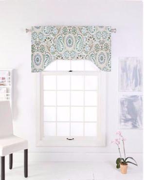The Paisley Prism lined arch valance window curtain is an elegant lined valance window treatment with an arch shape made with a high quality 100% cotton fabric featuring a paisley floral print. This delightful print pattern features soft tones of brown, tan, green, blue and natural. This arch valance is lined with a natural color broadcloth fabric and finished with a corded edging along bottom to create a stunning effect when gathered on your curtain rod. This attractive arch valance is popular with our customers, due to it's unique arch shaped bottom, natural color lining and eye catching paisley print fabric. Designed with a 3 inch wide rod pocket to create this fantastic look using a flat continental curtain rod.