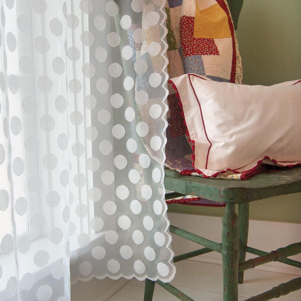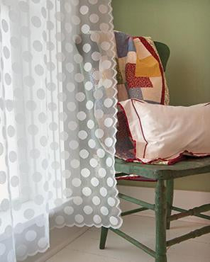 Combine the gentle light filtering softness of sheer netting with over-sized polka dots and you have a fun, go-anywhere panel to frame your windows. Delicate scallop detailing frames each curtain. Made in the U.S.A.