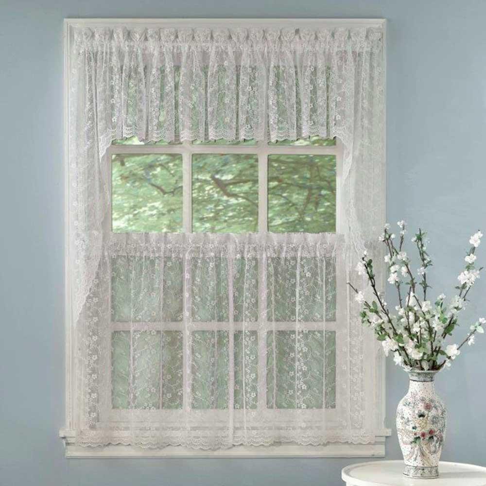 The classic delicate beauty of Bridal Lace tailored panel by Lorraine Home Fashions updated with a contemporary styled top treatment. Priscilla lace tier has an all-over floral scroll pattern beautifully finished with embellished scalloped bottoms in this tier, swag and valance.