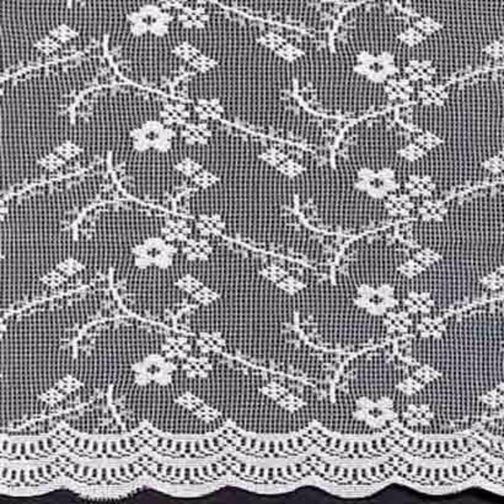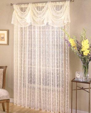 The classic delicate beauty of Bridal Lace tailored panel by Lorraine Home Fashions updated with a contemporary styled top treatment. All-over floral scrolled pattern beautifully finished with embellished scalloped bottoms on both panel and victory valance. The Priscilla lace design is also available as a kitchen tier, and swag.