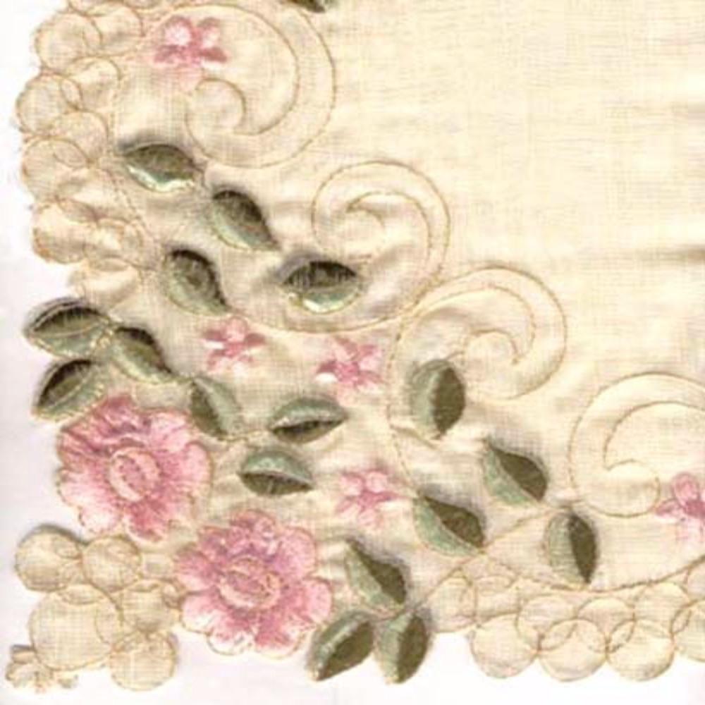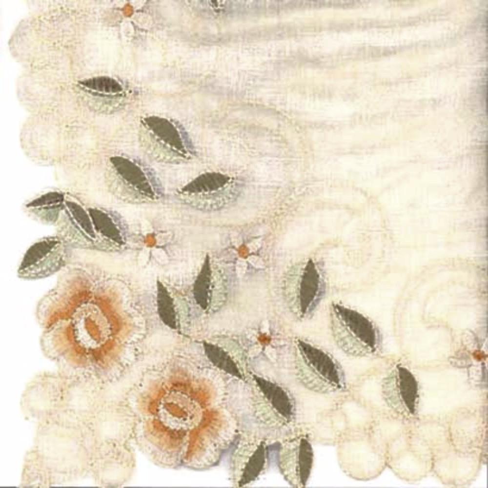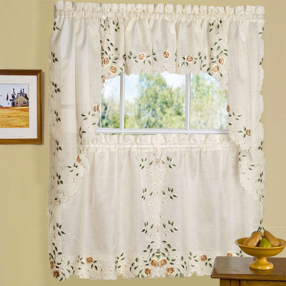 Rosemary is a multi-colored, heavily embroidered scrolling floral pattern on faux linen fabric, blends old world charm with an updated presentation by Lorraine Home Fashions. Rosemary tiers, valance and swag has a scalloped bottom edge over-stitched and embellished with embroidery. The antique beige base color gives your windows a warm glow and the floral scalloped hem adorn your window beautifully.