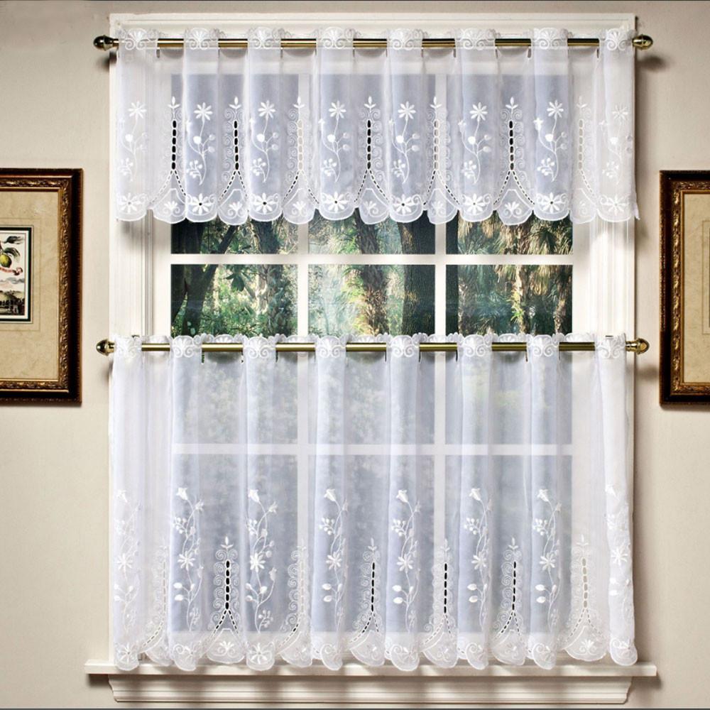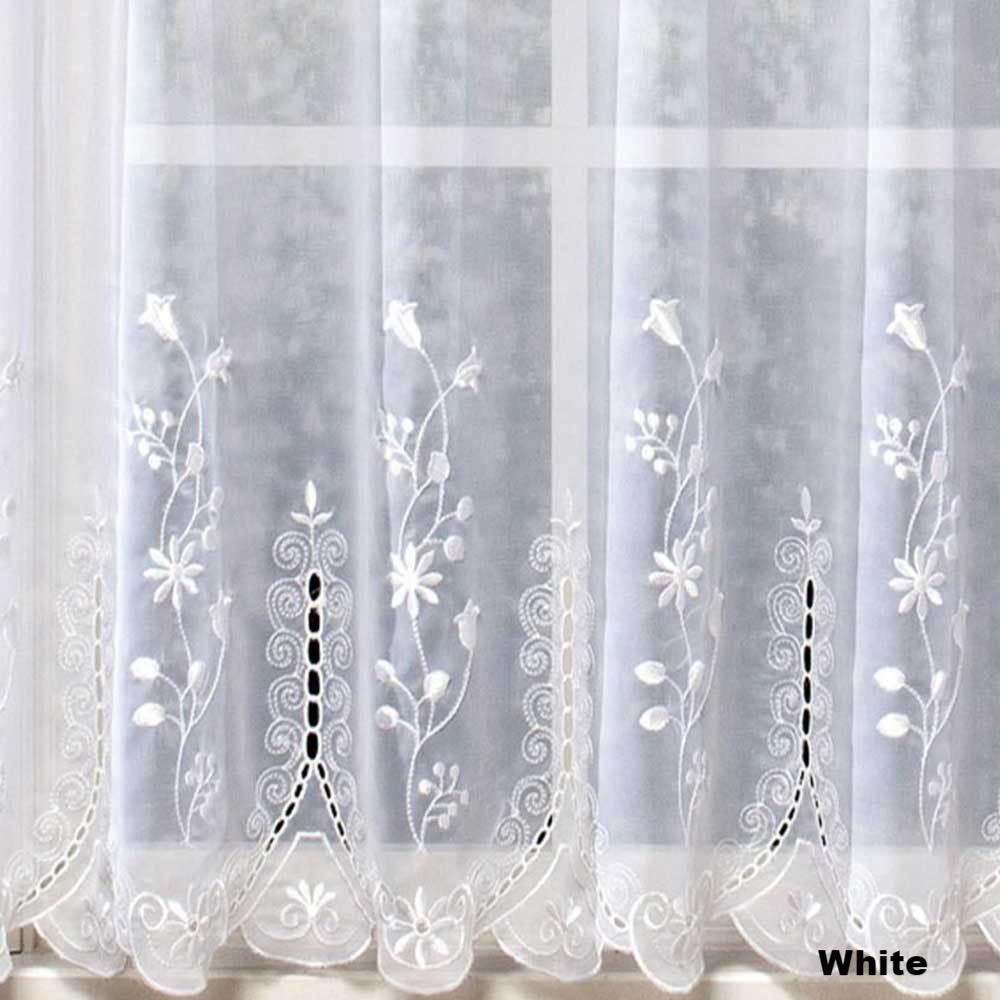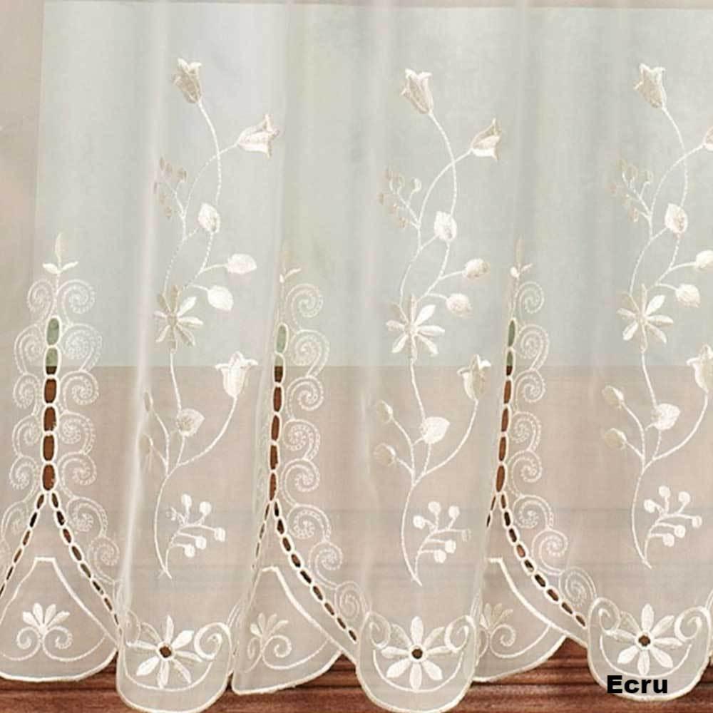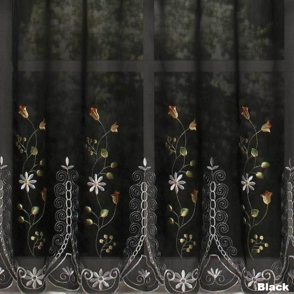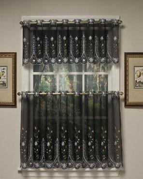 Samantha Tier and Valance by H.C.I is a lovely pleated curtain that will add elegance to any window in your home. The delicate floral embroidery on the smooth voile fabric will hang beautifully on your windows and the cut work detail on the rod pocket will look great against any decorative rod. The white and the ivory tiers have tone on tone embroidery work, while the black voile sheer really allows the design to pop with the use of white, orange, yellow and green floral embroidery.