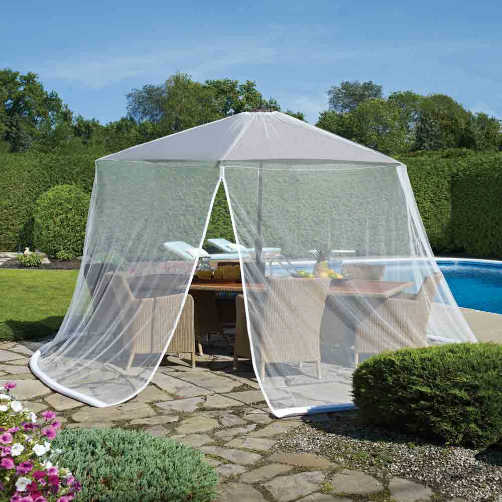 The Scram Adjustable Umbrella Screen is made of a lightweight netting, designed to set up easily over patio umbrellas with a cinch top, its see-through mesh construction won't obstruct your view. The netting is infused with an EPA registered natural mosquito repellent (Permethrin), it not only deters mosquitoes from getting into your outdoor living area, it repels them from it all together. The easy to fill bottom tube that runs the circumference of the bottom net securely keeps the netting in its desired location. Single entry, with heavy-duty zipper makes it very easy access in and out of your new party environment. Now you can enjoy your outdoor cookouts and parties without having to worry about mosquito bites or flies all over your food.