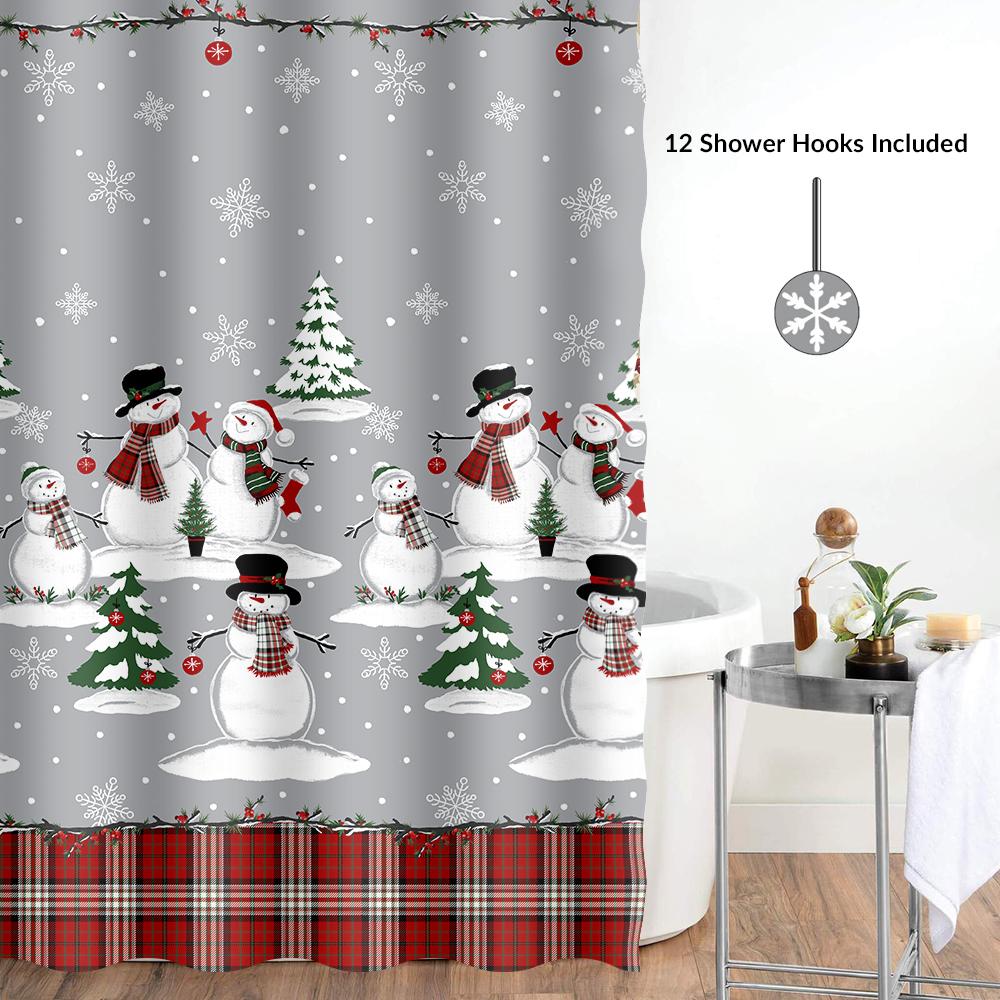 This snowman shower curtain have snowmen coming together and decorating pine trees as the snow lightly falls. A delicate top garland border and plaid bottom hem complete the classic holiday theme of this design. it comes with a set of 12 round hand-painted shower curtain hooks with a snowflake motif, it creates a winter wonder land look that is absolutely perfect for the holiday!