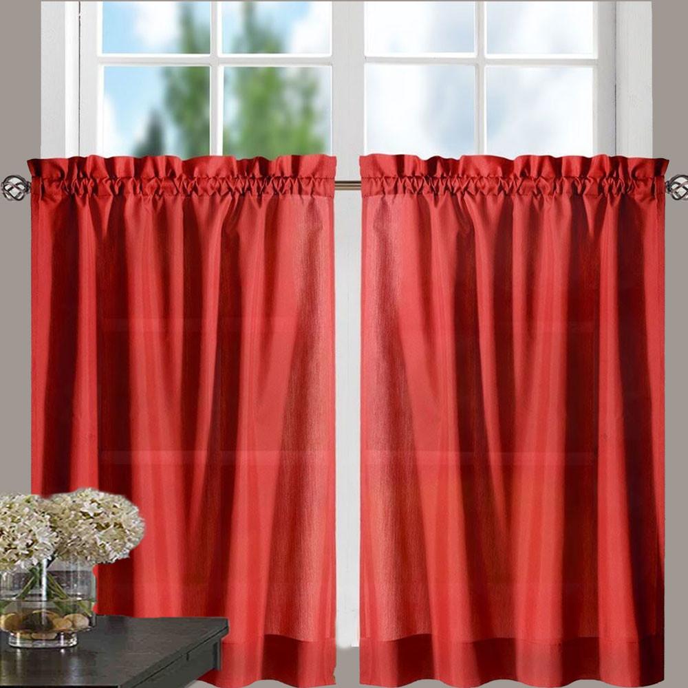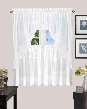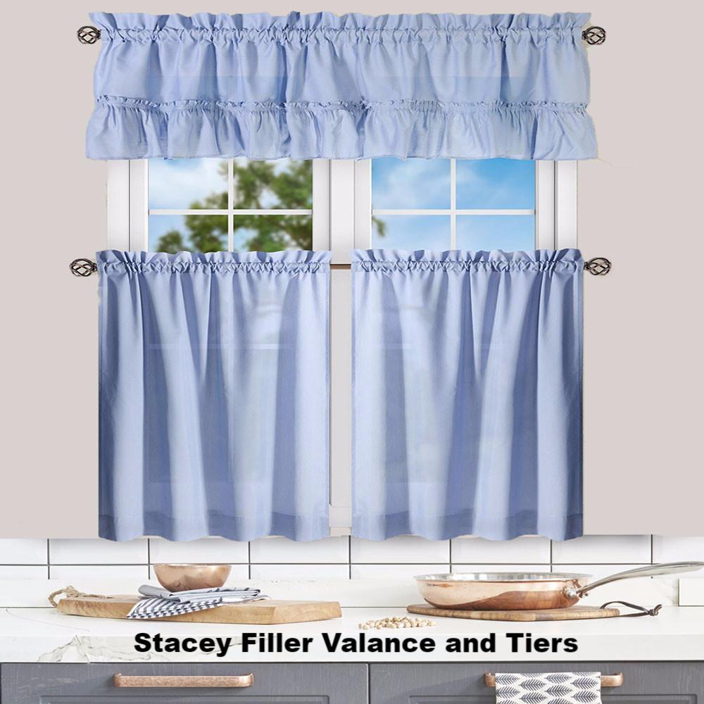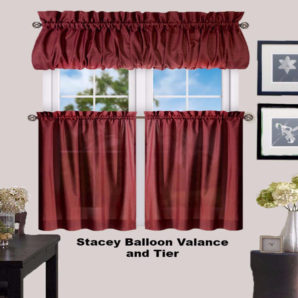 Stacey by Ellis is one of our top selling tiers, the solid colored program allows light to filter through but still gives you privacy. Stacey is available in a plain solid tier with a 1.5” rod pocket; the swag, valance and tiers can all hang on a café or conventional rod. The swag and valance have a 4.5” ruffled hem, which will adorably frame your window.