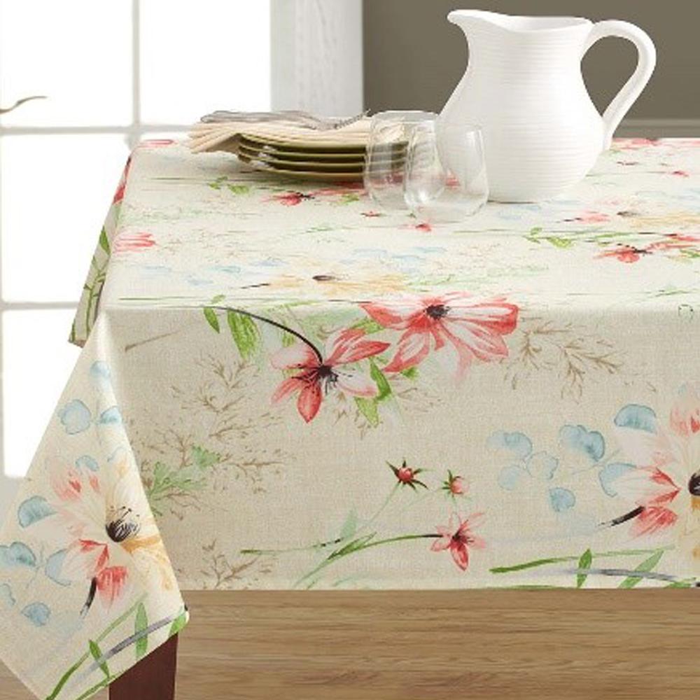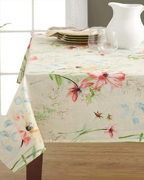 Adorn your table with a beautiful life-like floral drawing design featured on the Tabitha Indoor/Outdoor Spill Proof Tablecloth by Benson Mills. This tablecloth features realistic drawings of different pink, blue and yellow flowers. Perfect for the warmer weather, or bringing Spring into your home all year round. Treated with state of the art technology, all liquids including wine, bead up making the clean-up process an ease.