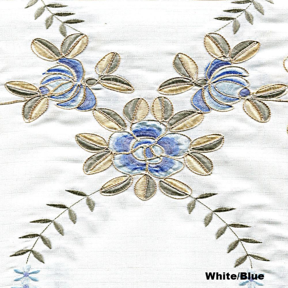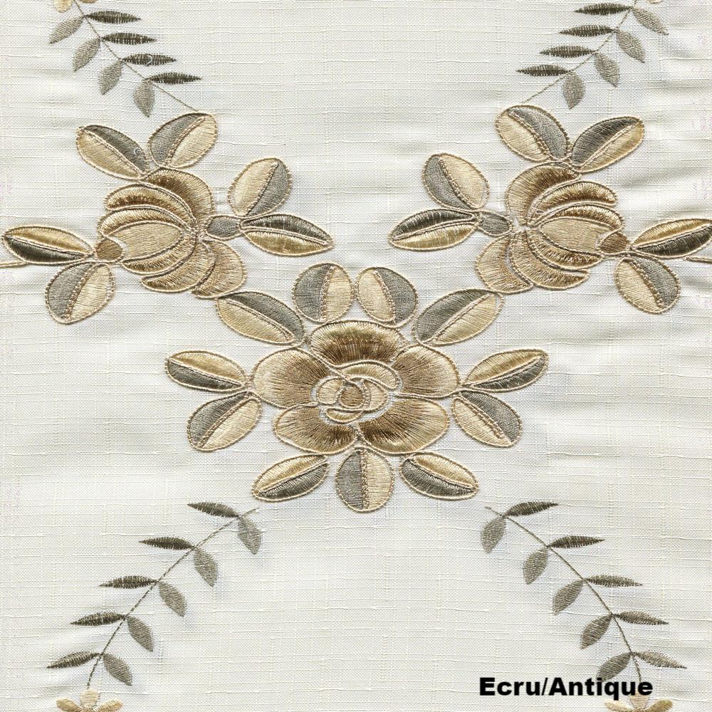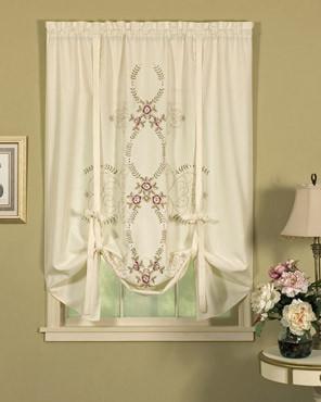 A beautifully embroidered tie-up shade that is embellished with scattered embroidered flowers which makes it a true show-stopping design. Also available are pairs of panel with tiebacks, kitchen curtain and tailored valance. Both with rod pockets.