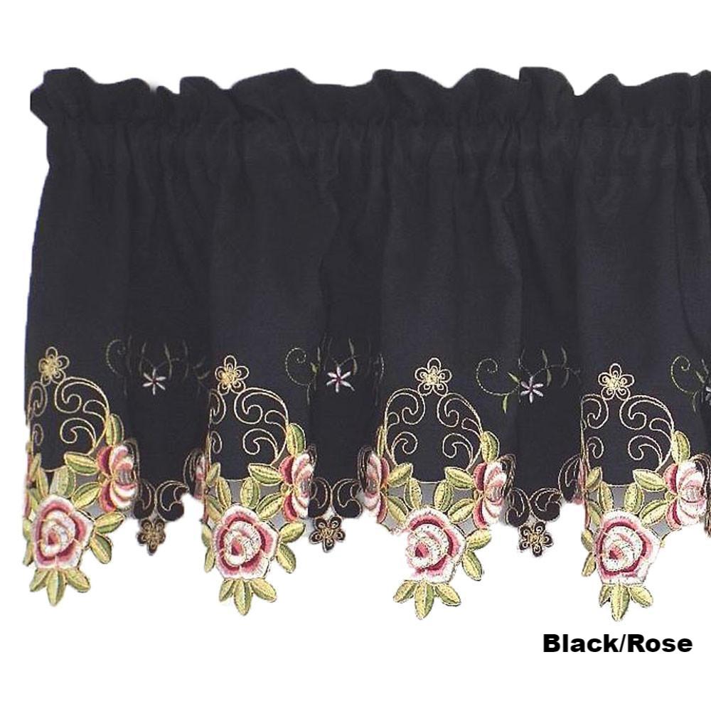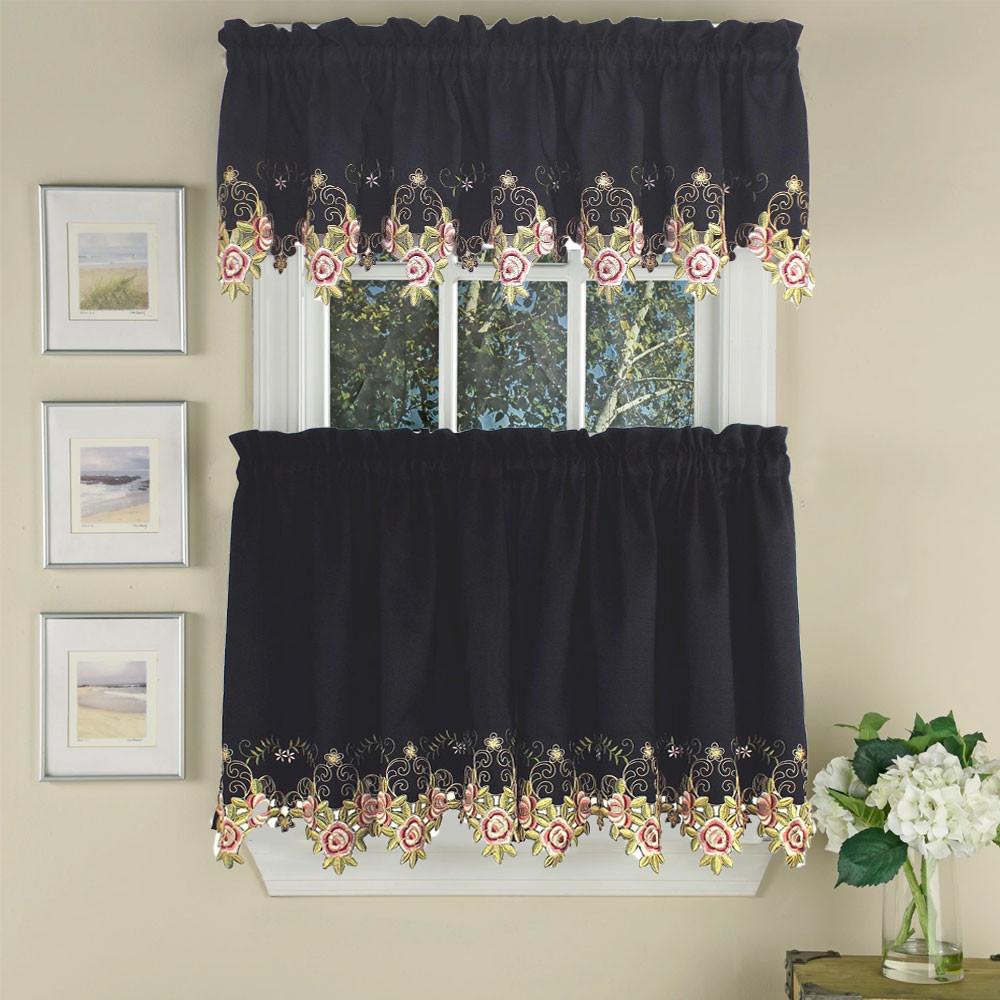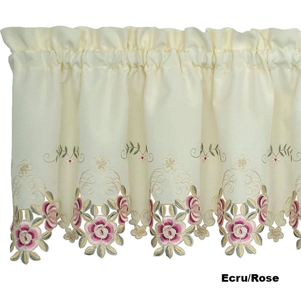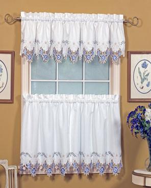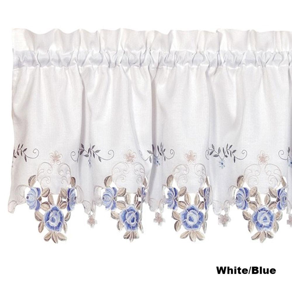 The gorgeously detailed Verona tier has a 7" inch embroidered flower and intricate cutwork detail along the hem. The gorgeous floral design truly makes for show stopping windows. Shown in the image is a Verona valance and 24" inch pair of tiers sold separately, also available is a pair of swags which could be hung alone or on each side of the valance. To continue the Verona look throughout your home a pair of window panels with tie-backs and tie-up shade can be purchased separately.