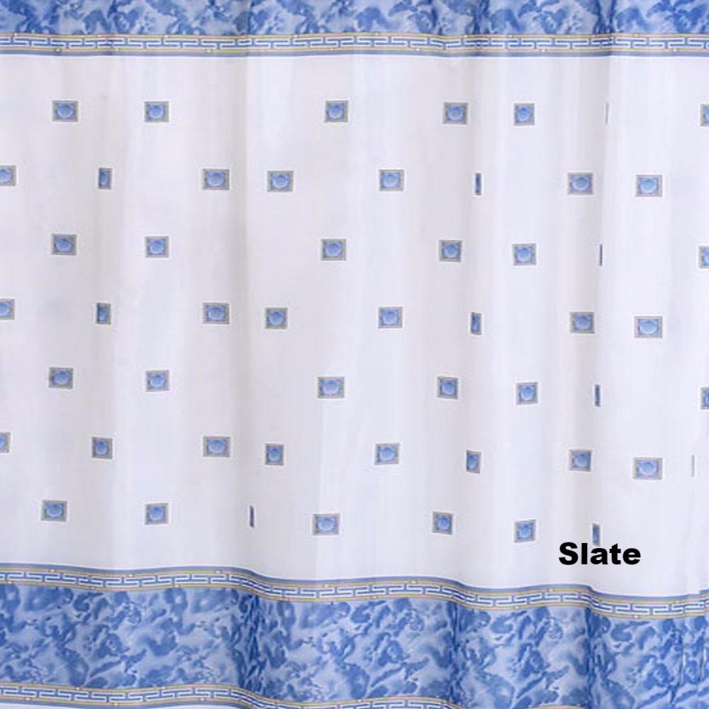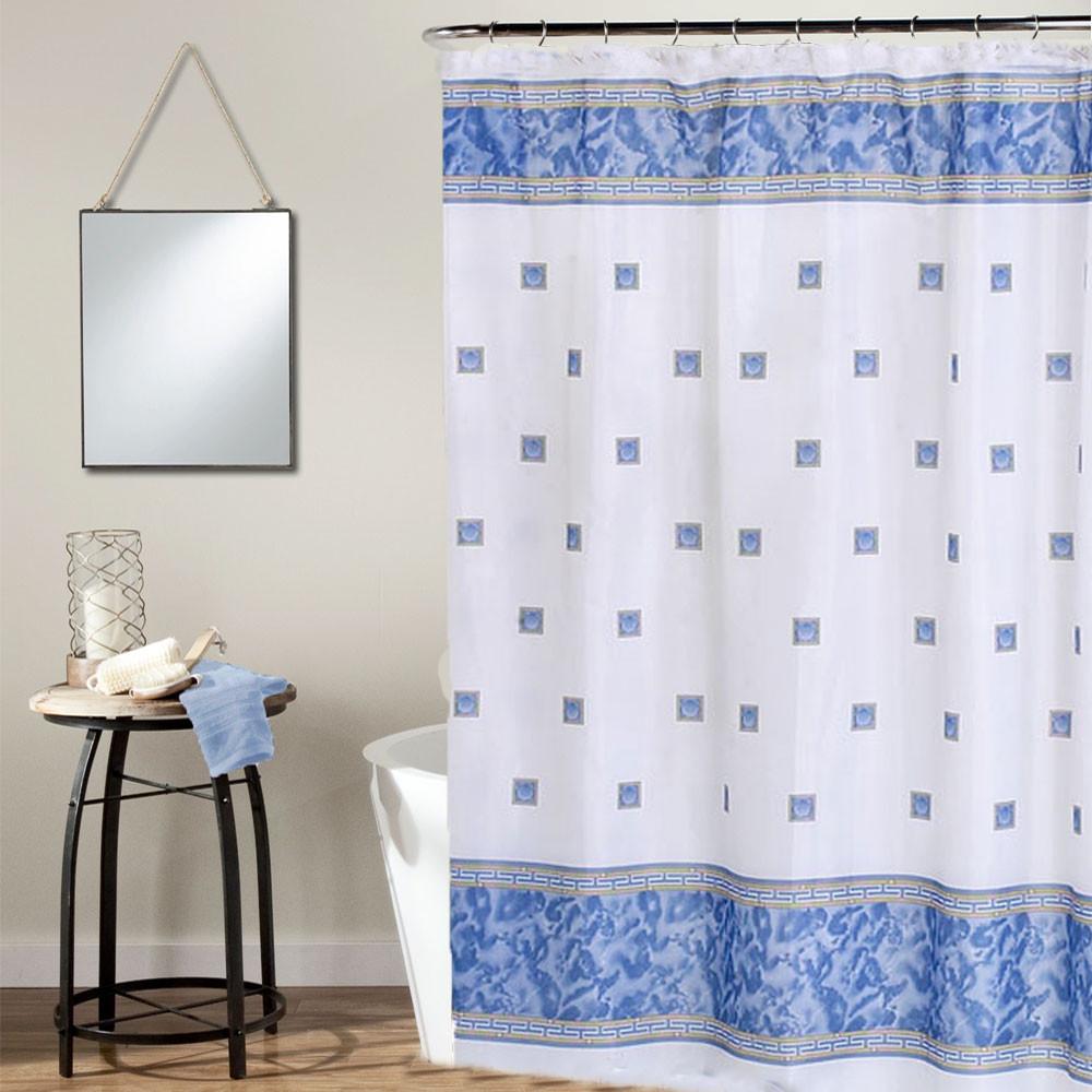Add a touch of class to your bathroom with its classic "Greek Key" Design this beautiful Windsor Fabric Shower Curtain. Features a classic marble band on the top and bottom; an seashells speared in the middle on a crisp white background are the perfect combo to make your bathroom look like a seaside palace. Available in 5 different color you will surely be able to match one to your bathroom decor.